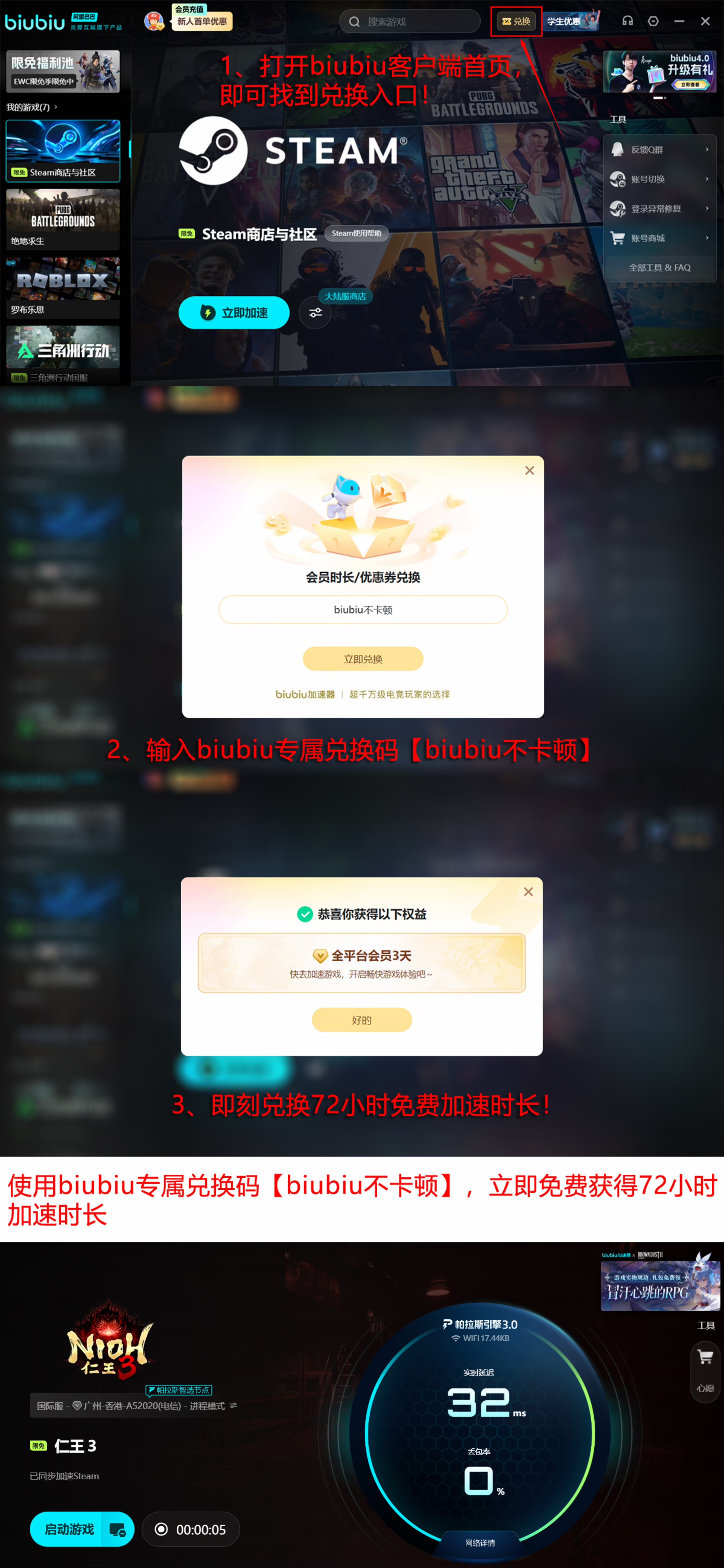 使用biubiu加速前,建议优先领取全部可用加速权益。新注册用户可享24小时免费加速时长;所有用户(含新老)均可通过兑换码【biubiu不卡顿】额外获取3天连续加速服务,新用户累计最高可获得72小时无门槛加速体验。