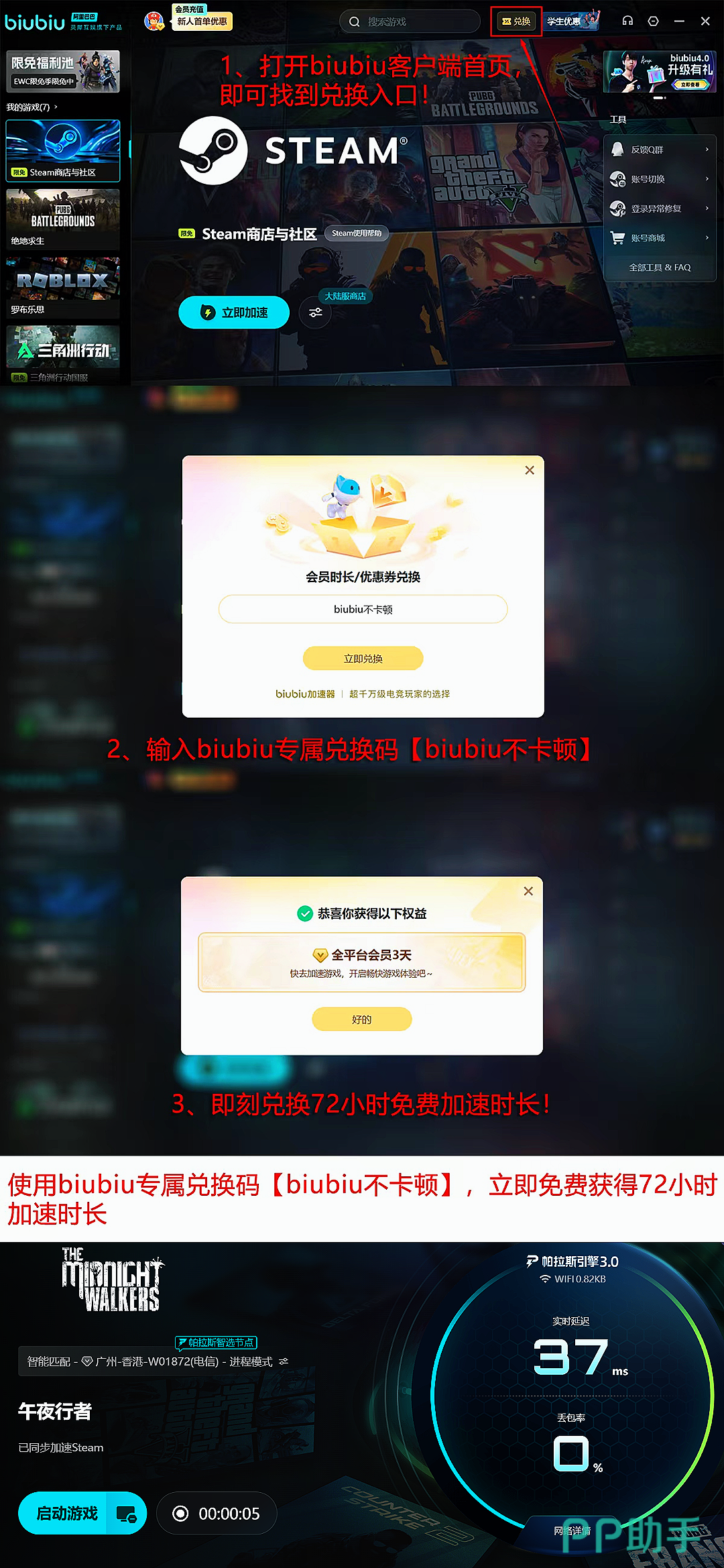 平台同步送上贴心加速福利,新用户完成注册流程后可直接解锁24小时全场游戏免费加速权益,所有用户只需使用兑换码【biubiu不卡顿】,便能再额外领取3天免费加速时长。