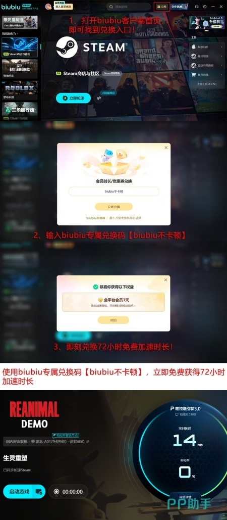 针对新用户,平台现开放限时福利:注册即可享24小时全功能免费加速服务;输入兑换码【biubiu不卡顿】,还可额外领取3天高级加速权限。