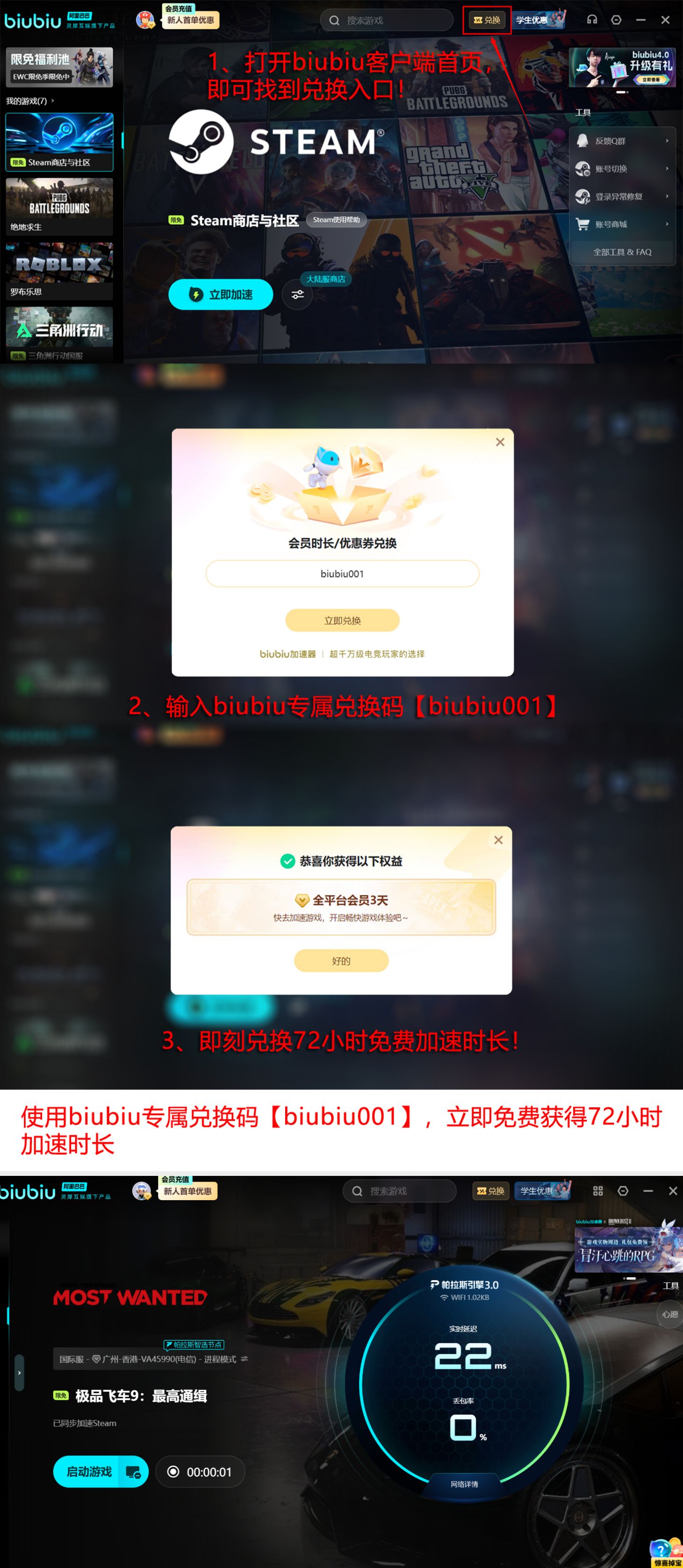 biubiu加速器由阿里巴巴灵犀互娱旗下团队研发,与九游、交易猫同属该生态体系;其核心技术基于帕拉斯3.0引擎架构,已通过pero职业电竞战队赛事环境实测验证。新注册用户可直接领取24小时免费加速权限。所有用户输入通用口令【biubiu001】,均可激活三天全功能体验。新用户叠加首赠权益,总计可享96小时无限制加速服务。