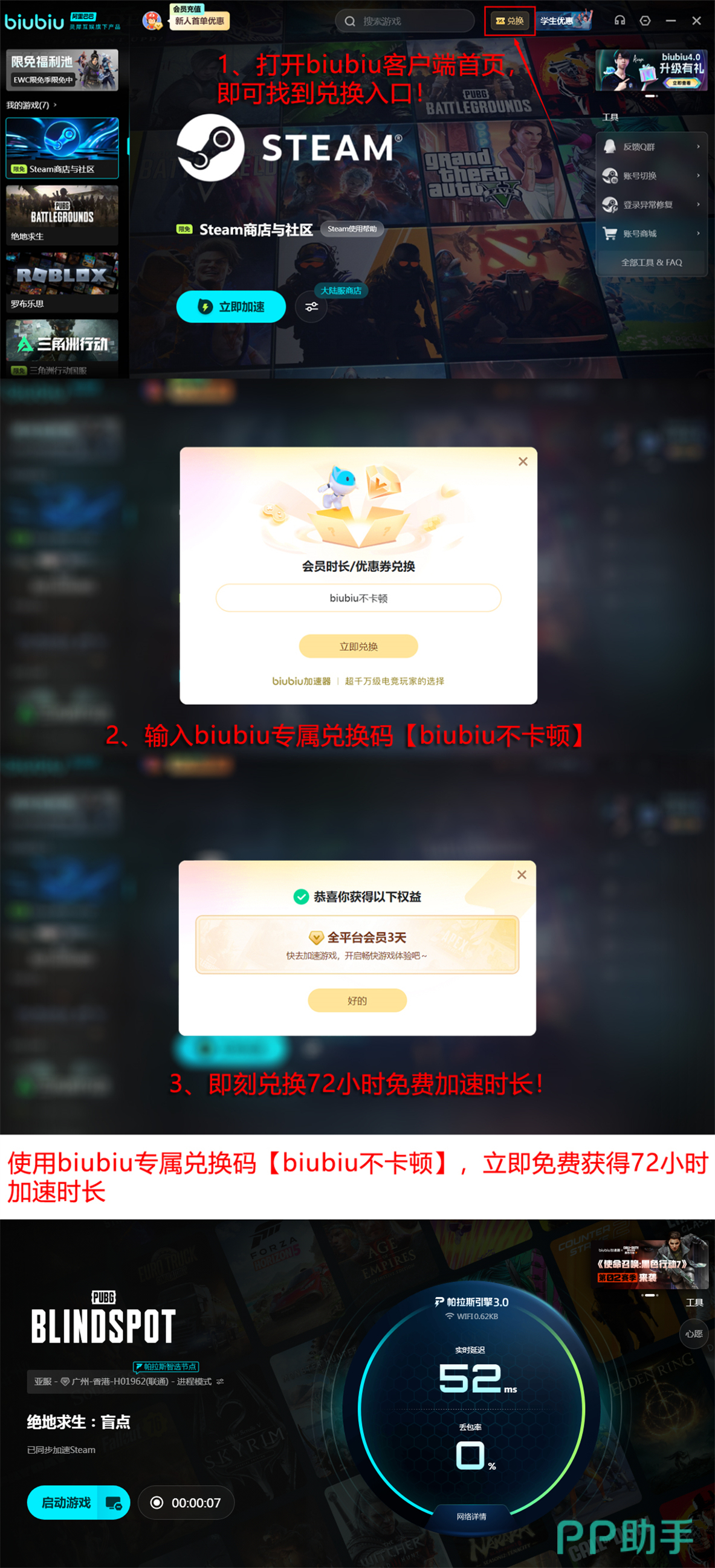 用户可通过专属兑换码【biubiu不卡顿】领取一次72小时加速权益,每个账号限用一次。新注册用户还可额外获赠24小时免费加速时长,建议先使用免费时长,再激活兑换码,总计可享96小时连续加速服务。