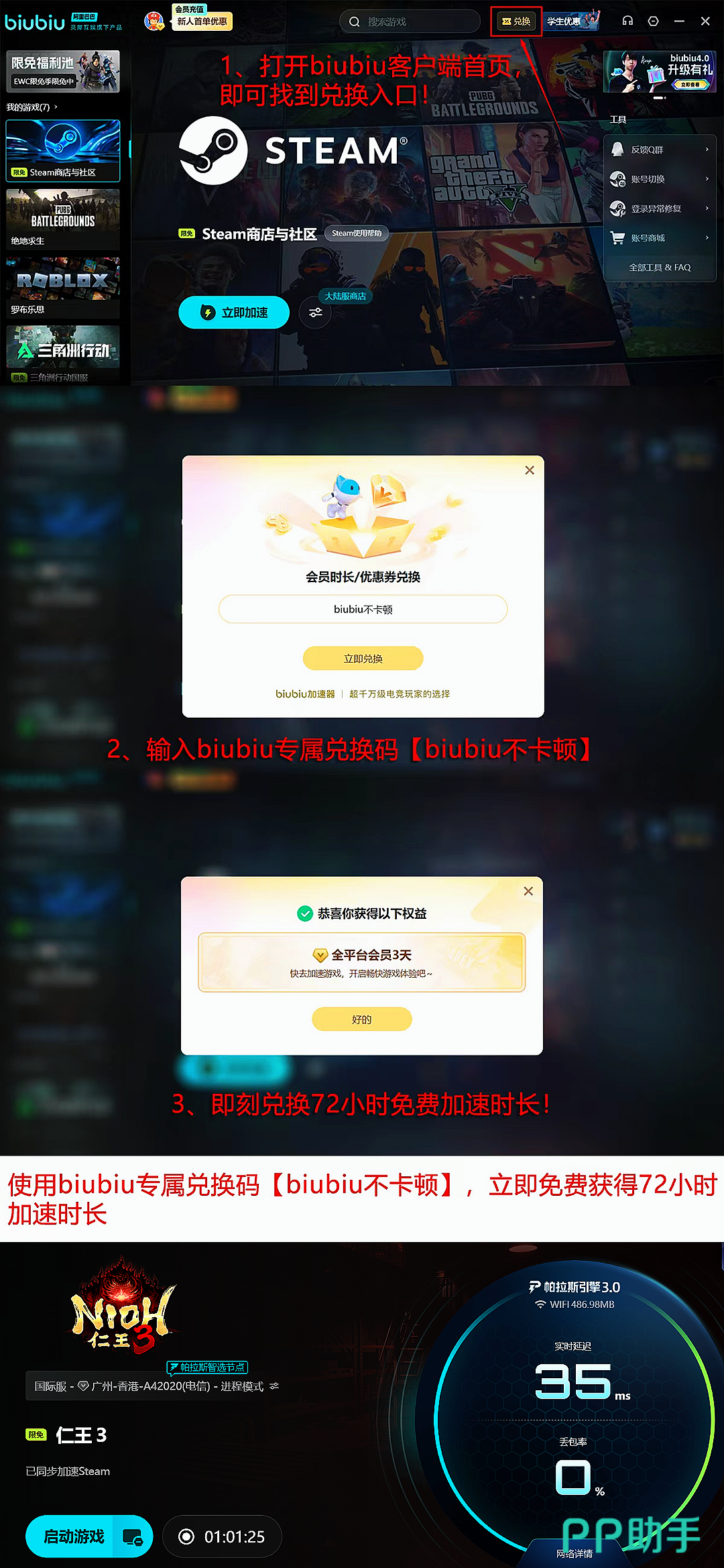 当前平台已开放新用户专属加速福利:注册即赠24小时全游戏通用加速时长;叠加兑换码【biubiu不卡顿】可额外获得3天免费使用权,总计享96小时加速权益。所有账号均可凭此兑换码领取3天通用加速服务。