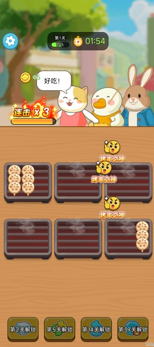 创新融合烧烤主题与三消机制:拖动三个相同食材合成串品。肉类需两次合成达成全熟状态,蔬菜一次即出品,海鲜具备防糊保护——过烤将触发焦黑特效并扣除分数。顾客订单实时刷新,倒计时机制增强操作紧张感。闯关所得金币可用于摊位装修,桌椅、墙面等装饰自由搭配;新食材逐步解锁后,可拓展烧烤品类,吸引更多顾客光临。操作直观易学,道具系统提供关键节点辅助支持。