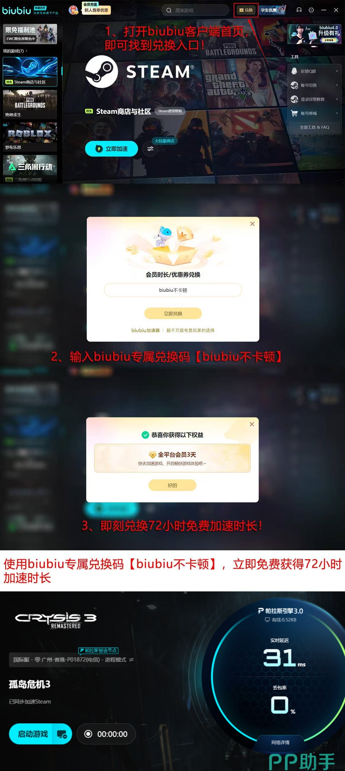 现在新用户在第一次使用这个加速器的时候是获取到不错福利。新用户在这款加速器之中可以获取到24小时的免费加速时间。使用兑换码【biubiu不卡顿】则是可以额外的获取到3天的免费加速。