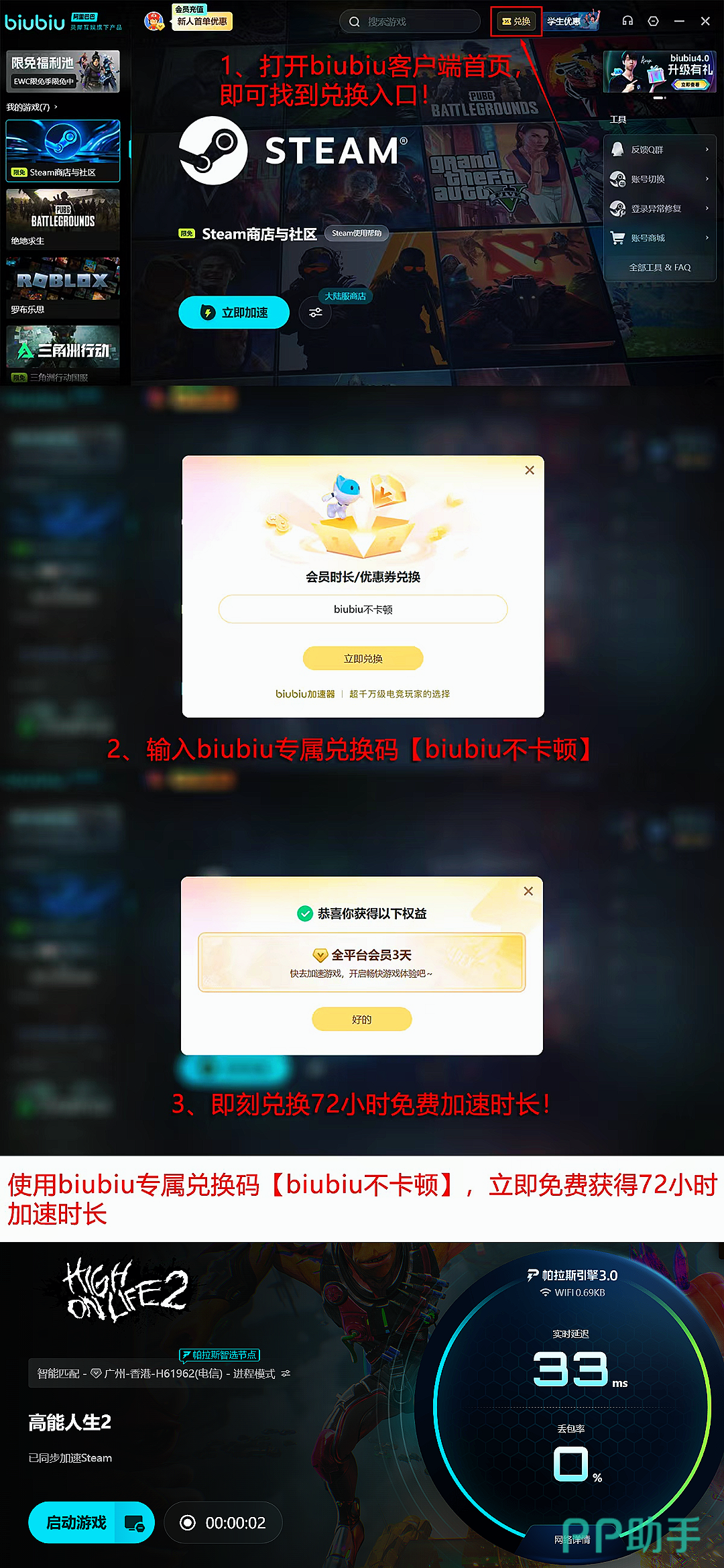 为持续提升用户体验,现面向全体用户推出限时福利:输入兑换码【biubiu不卡顿】,即可获赠3天全游戏加速服务;新注册用户完成账号激活后,自动解锁24小时全场游戏免费加速权益。