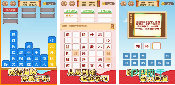 本作是款包含着成语接龙以及成语消除类型玩法的休闲手游,寓教于乐的游戏概念跟成语主题的玩法进行结合,关卡设定也是从简单到困难玩起来十分过瘾,锻炼大脑的成语知识训练玩法也值得挑战,个性化的操作机制带来的休闲感也不错,许多常见或者生僻的成语知识也足以让朋友们大开眼界。