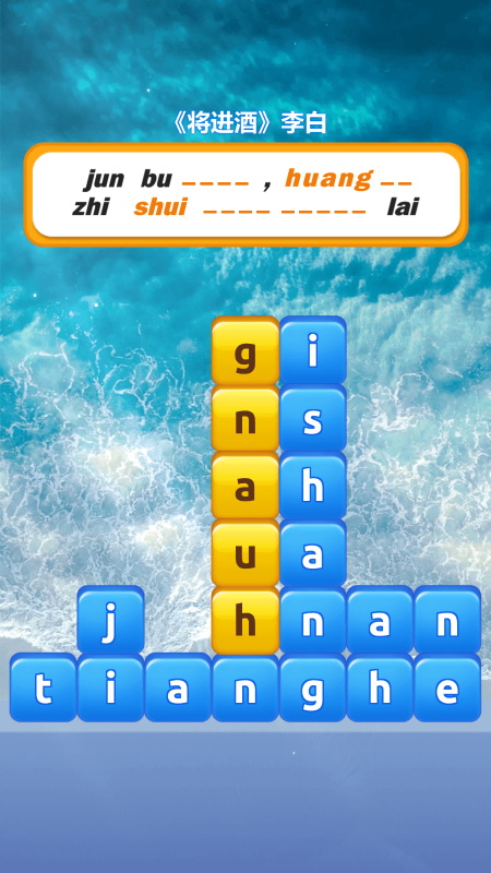 本作的核心内容是“拼音闯关”,玩家需要根据系统提示的拼音线索,拖拽组合字母方块,拼出正确的词语或成语。游戏中除了基础的词汇,还将古典诗歌融入关卡,让每一关都充满了文化和逻辑的挑战。游戏在视觉上清新美观,以水墨画风营造出治愈和谐的氛围。关卡难度也是层层递进,由易到难。完全满足从学前启蒙到小学衔接的学习需求。