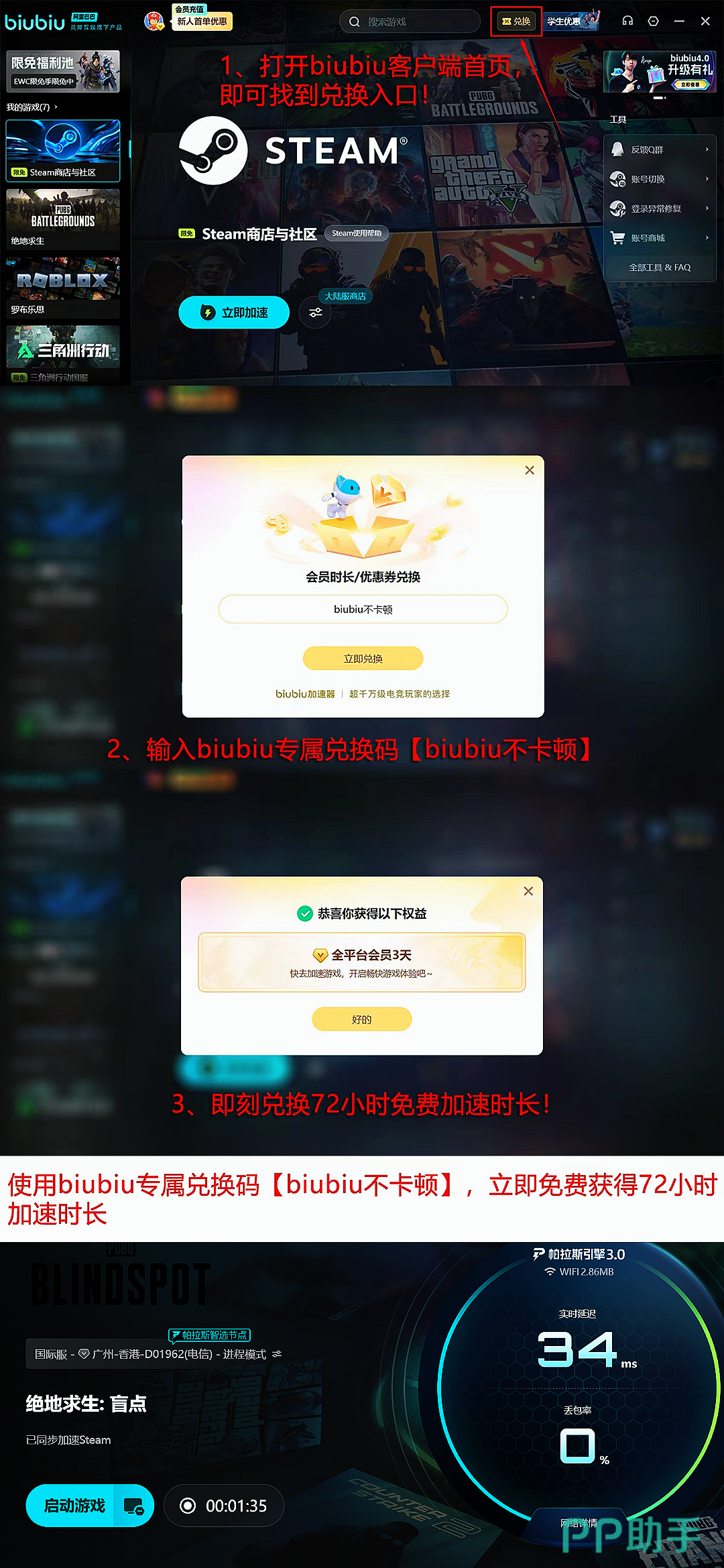 面向全量用户推出多重加速福利:输入兑换码【biubiu不卡顿】可即时领取3天全游戏免费加速;新用户完成注册即赠24小时全场通用加速权益;两项叠加即可享总计96小时加速时长。。
