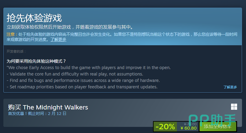 《午夜行者》采用一次性买断制,目前国区标准售价为76元,首发期间享有20%限时优惠,折后仅需60.8元。该折扣有效期至2026年2月12日,期满后将恢复原价。对于计划体验本作的玩家而言,当前是性价比最高的购入阶段。