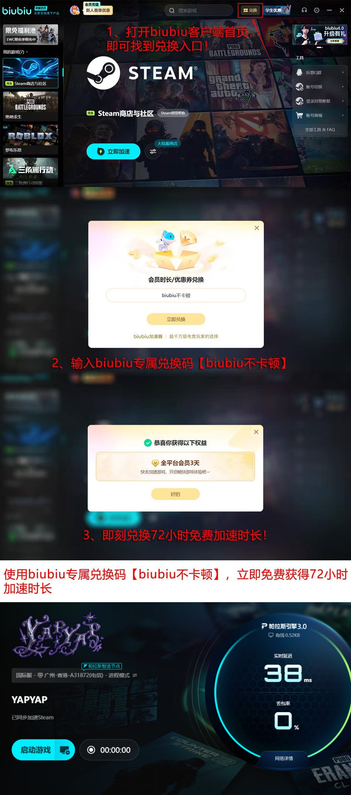 新用户注册即可获赠24小时免费加速时长;另在主界面输入口令“biubiu不卡顿”,还可额外领取72小时会员权限。两项权益可叠加使用,总计享有96小时加速服务。
