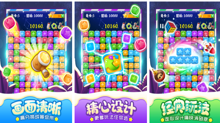 本作是款拥有经典玩法和全新规则概念的免费消除游戏,画面呈现方面小清新也有着超多的模式可以选择,精心设计的各类关卡带来的解压休闲体验也不错,画面色彩鲜艳也有着超酷的消除特效,简易好玩的操作设定也是众多玩家的最爱,消除星星获取积分的游戏机制简单好上手,爱玩消灭星星主题休闲手游的朋友来试试吧。