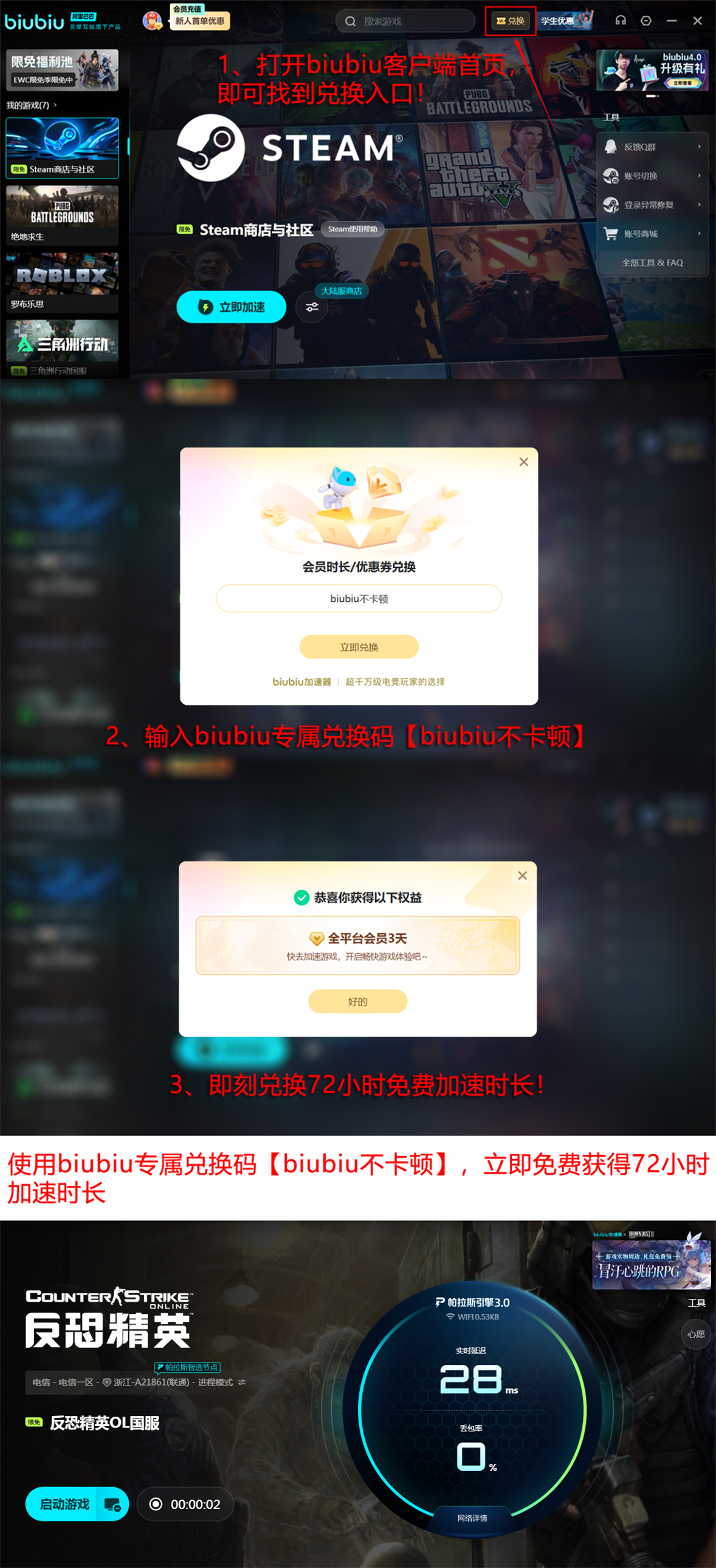 新用户注册biubiu加速器账号后,可立即享受24小时免费加速服务,该权益长期有效。此外,每位账号还可凭兑换码【biubiu不卡顿】额外领取72小时加速时长,合计达96小时,足以完成多场高强度对战。除网络优化外,biubiu平台同步整合CSOL攻略数据库、版本更新日志、战术教学视频及玩家社区讨论区,便于用户全面掌握游戏机制、提升实战水平。