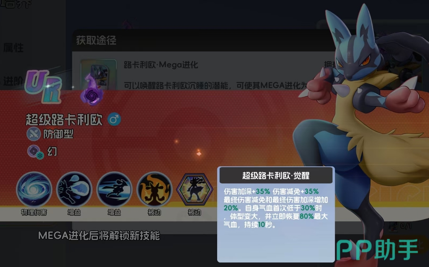 宠物集结中的超级路卡利欧只能通过让利欧路完成MEGA进化来获得,并且它在进化后与其他完成了MEGA进化的宝可梦一样,都能获得一个额外的觉醒技能。该技能初始阶段仅会提供伤害增加5%和伤害减免5%的效果,可一旦玩家将超级路卡利欧的MEGA进化突破到上限,技能的效果会得到极大加强,不光伤害增加和伤害减免都会提升到35%,还能享受到额外的最终伤害减免和最终伤害增加都提高20%的效果,且超级路卡利欧在血量低于30%时体型会变大,并立刻为自己恢复80%的血量,令它能更好地担起承伤的作用。