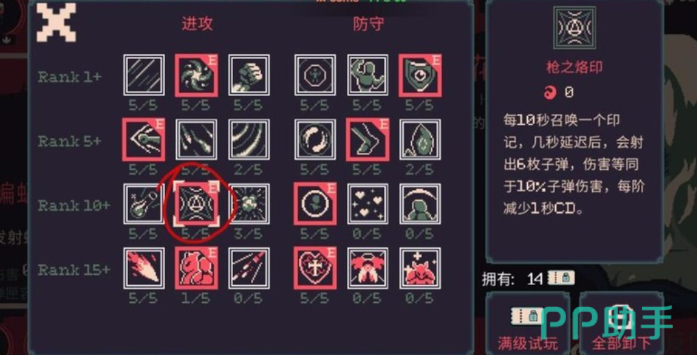 符文配置需彻底规避依赖“主动开火”的增益。唯一保留的枪械类符文为“枪之烙印”,其余槽位应全部用于强化非射击类伤害效果——重点提升点燃、冰冻等持续性元素特效的触发频率与覆盖率。“枪之烙印”本身不依赖手动射击:每10秒自动生成一枚印记,延迟后将一次性发射6发子弹;且该效果随等级提升,冷却时间显著缩短,是支撑“零开火”玩法的核心底层机制。