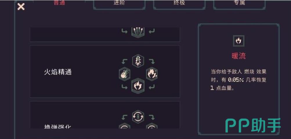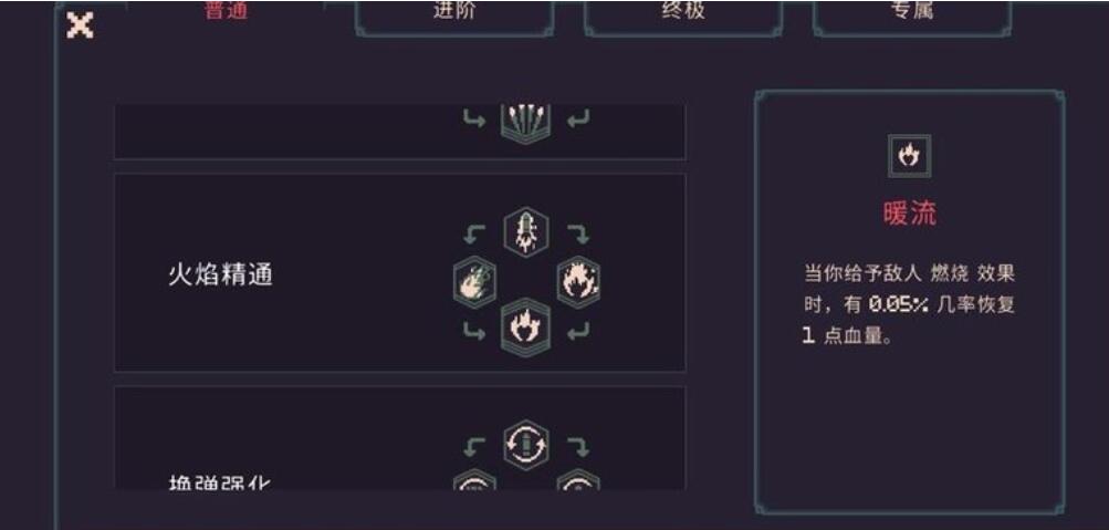 核心机制在于:暖流天赋本身可对敌人施加燃烧状态,但单层点燃的吸血转化率有限;若搭配炎晶天赋,则每发子弹可同时触发多层点燃效果,从而将伤害转化为稳定、高频的生命恢复。该组合并非单纯堆叠伤害,而是通过“多层叠加+持续灼烧”形成正向循环——血量越健康,输出越激进;输出越密集,回血越充沛。