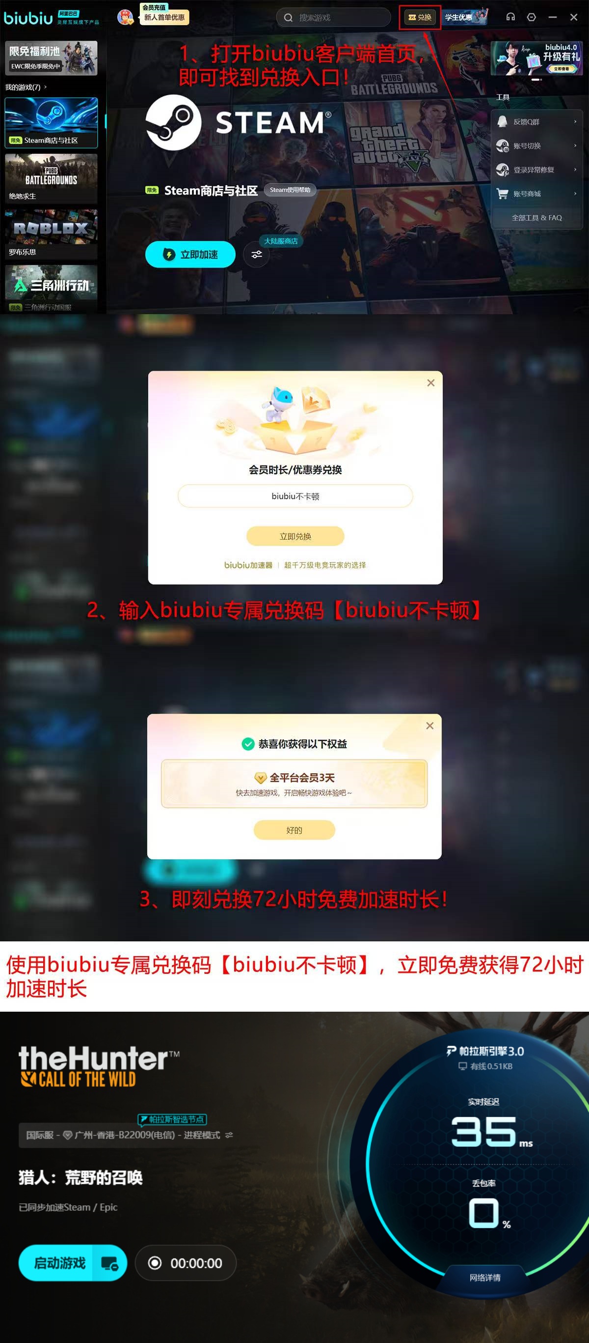 新用户完成注册,即可领取官方提供的24小时免费加速时长;此外,所有用户(含新老用户)均可输入“biubiu不卡顿”口令,额外兑换3天免费使用权限,两项叠加后总计可享4天无限制加速服务。
