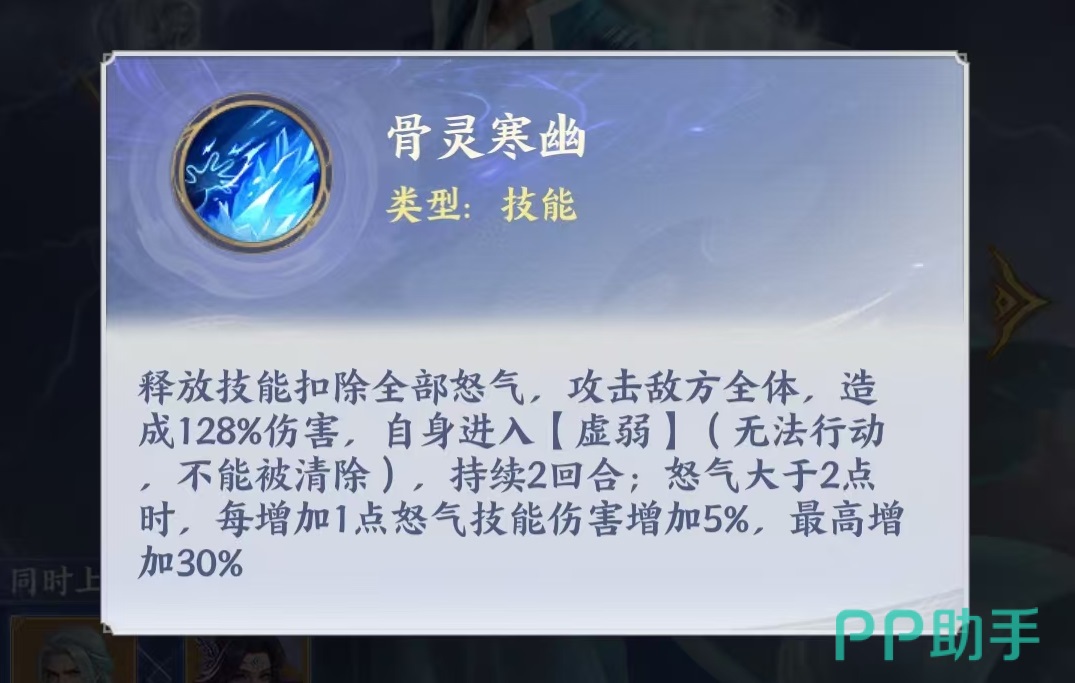 药老被设定为火系阵营的核心主C,定位为物理型群体伤害输出者。其战斗机制具备显著辨识度:全程无法进行普通攻击,每次行动均强制释放主动技能“骨灵寒幽”。该技能需消耗全部怒气值,对敌方全体造成高额物理伤害;怒气值超过2点时,每增加1点怒气,技能基础伤害提升相应比例。释放后,药老将进入持续两回合的虚弱状态。后续通过升星可解锁进阶效果——若技能成功击杀敌方单位,则虚弱时间减少1回合;同时,当目标当前生命值高于80%时,该技能还将触发额外伤害加成。