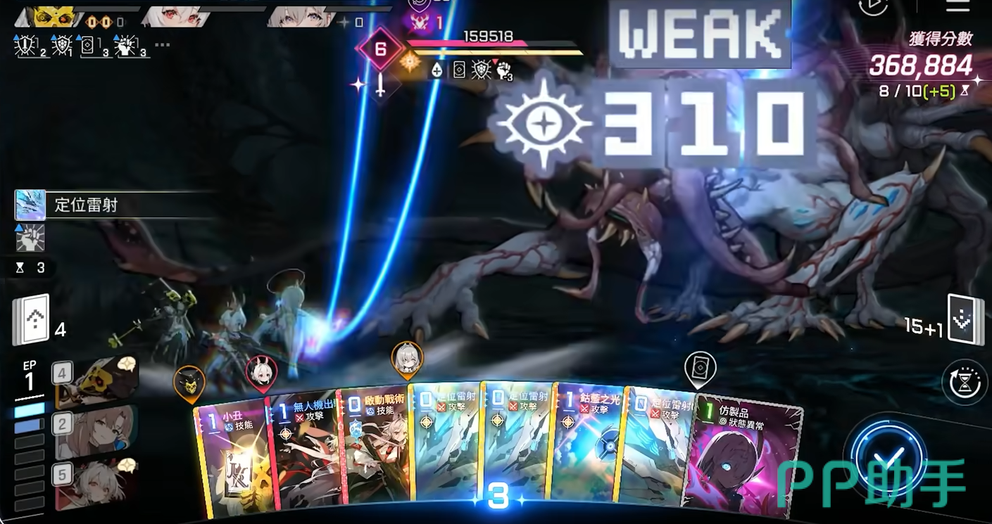 功能型卡牌“电浆飞弹”提供180%韧性伤害,若目标未被击破则自动重投一次,等效实现两次稳定韧性打击,在破韧过渡阶段表现优异;“闪耀核心”作为强化类卡牌,推荐生成两张“定位镭射L”,通过多次触发击破机制,显著提升整体破韧效率与持续压制能力。
