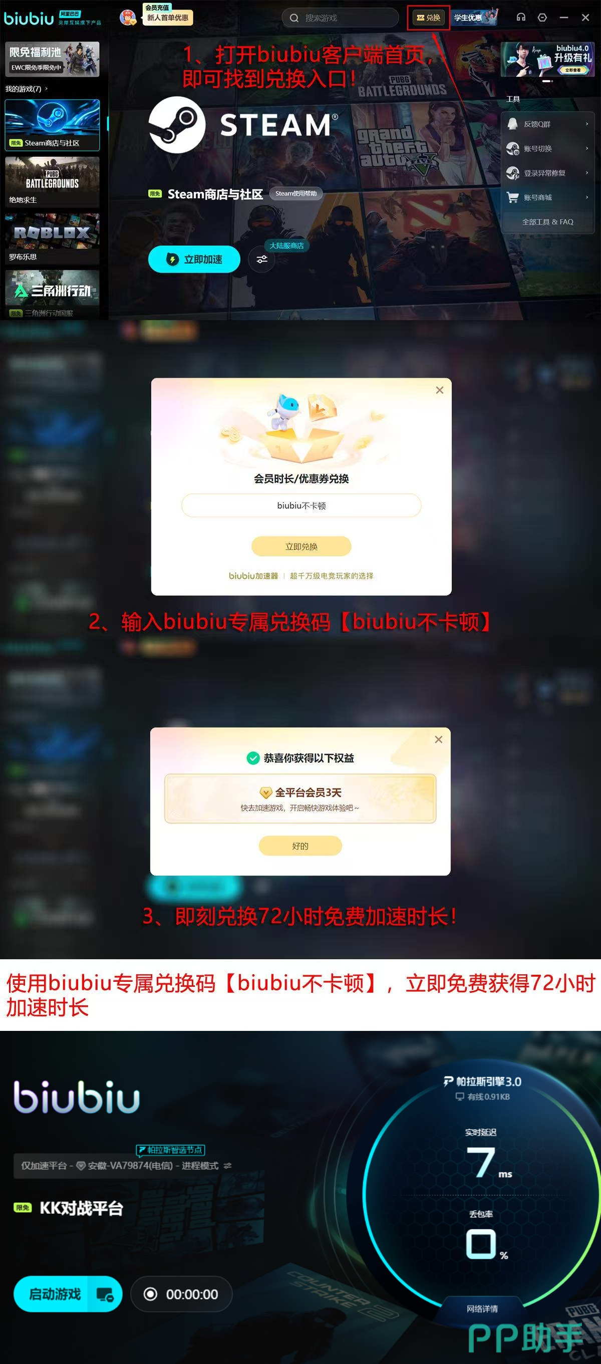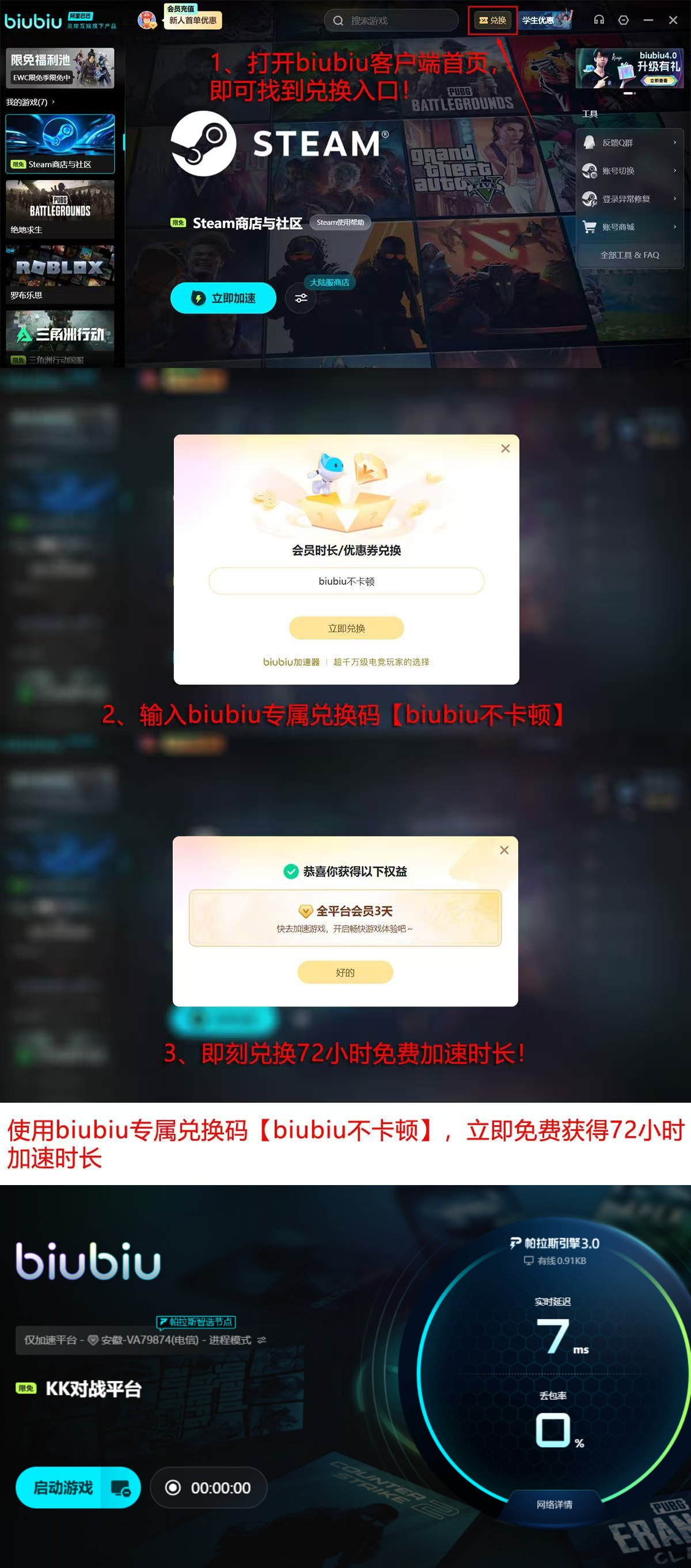 第三项优势体现在用户权益层面。目前新用户可通过活动入口输入兑换码【biubiu不卡顿】,直接获取72小时免费加速时长;若为首次注册账号,还可叠加领取额外24小时加速权限,合计享96小时无门槛试用期,远超同类产品的常规福利标准。