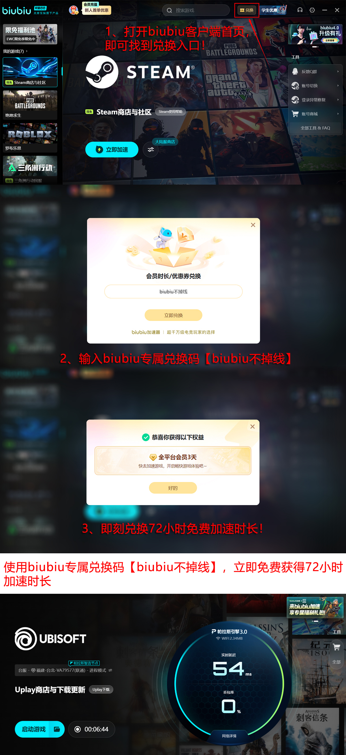 目前输入激活暗号 【biubiu不掉线】即可免费领取3天全速加速权益;新用户完成首次注册后,还将额外获赠24小时使用时长,总计可享96小时体验时间。