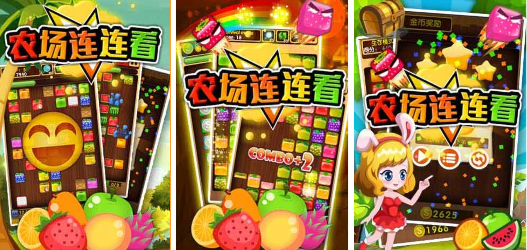 《农场连连看》打造出一个极富田园美感且洋溢着丰收喜悦的消消乐农庄,玩家操控各种新鲜饱满的农作物图符,在满是泥土气息的棋盘阵列里依靠敏锐的观察力来寻找匹配点。本游戏的主要玩法就是季节变化的体验和消磨节奏的掌控,尤其遇到需要迅速清理堆积成山的南瓜、玉米等作物的挑战的时候,就需要根据不同的作物阴影来制定不同的计划。面对各种极度的季节性限制挑战的时候,玩家必须保持高度集中,才能体验到纯粹的的碰撞玩法。