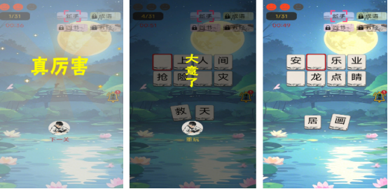 面向全年龄段用户,提供多样化成语训练模式,包括成语接龙、看图猜成语、释义匹配等。其中“看图猜成语”模块采用高清手绘风格插画,图像细节紧密呼应成语典故或字面意象,考验玩家的形象联想与文化迁移能力;“成语接龙”则强调词汇储备与反应速度,在连续输出中自然强化高频成语使用习惯。