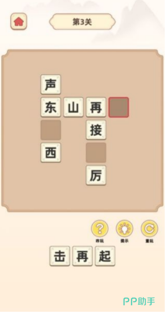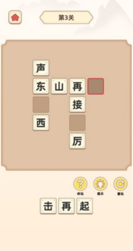 以成语填空与阶梯式闯关为设计主线,题库覆盖常用及进阶成语超千条。每道题目呈现一个残缺成语(缺失1至2字),下方提供若干单字选项,玩家需精准识别语义逻辑与固定搭配,完成补全。关卡难度由浅入深,从小学课标常见成语起步,逐步过渡到典故性、多义性较强的高阶表达,兼顾知识性与挑战性。