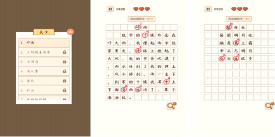 划分为五大主题模块,首页直观展示分类入口。已收录300余首中小学语文课程标准推荐篇目,包含绝句、律诗、词作等多种体裁。核心玩法之一为“诗句连线”,要求玩家将打乱顺序的上句与下句准确配对;关卡布局具备随机性,每次开启均需重新观察字词结构与韵律特征,有效锻炼语感与整体认知能力。