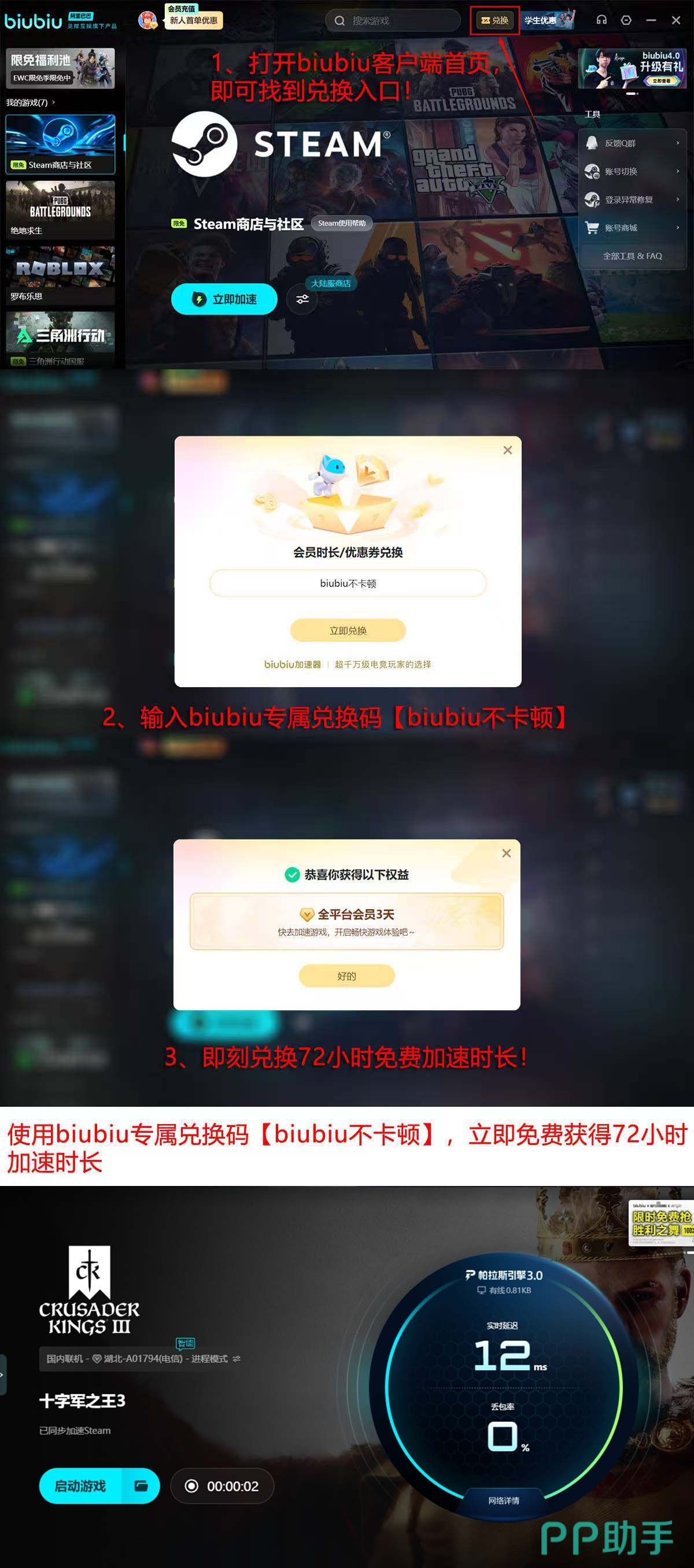 对于新用户,可立即获取总计96小时免费加速时长:完成安装并注册账号后,系统自动发放24小时基础时长;随后进入首页点击“兑换”,输入口令【biubiu不卡顿】,即可额外获得72小时权益,所有时长叠加生效。