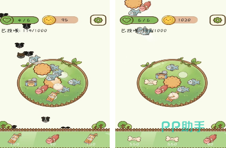 游戏围绕圆形合成盘展开,玩家通过拖拽操作将相同类型的食物道具投入盘中,单盘上限为9格。当两个同级食材相邻时可自动升级为更高级料理(如双苹果→苹果派→水果塔)。虽操作简洁,但需兼顾空间布局、合成优先级与宠物偏好,强调资源管理与长期规划思维。