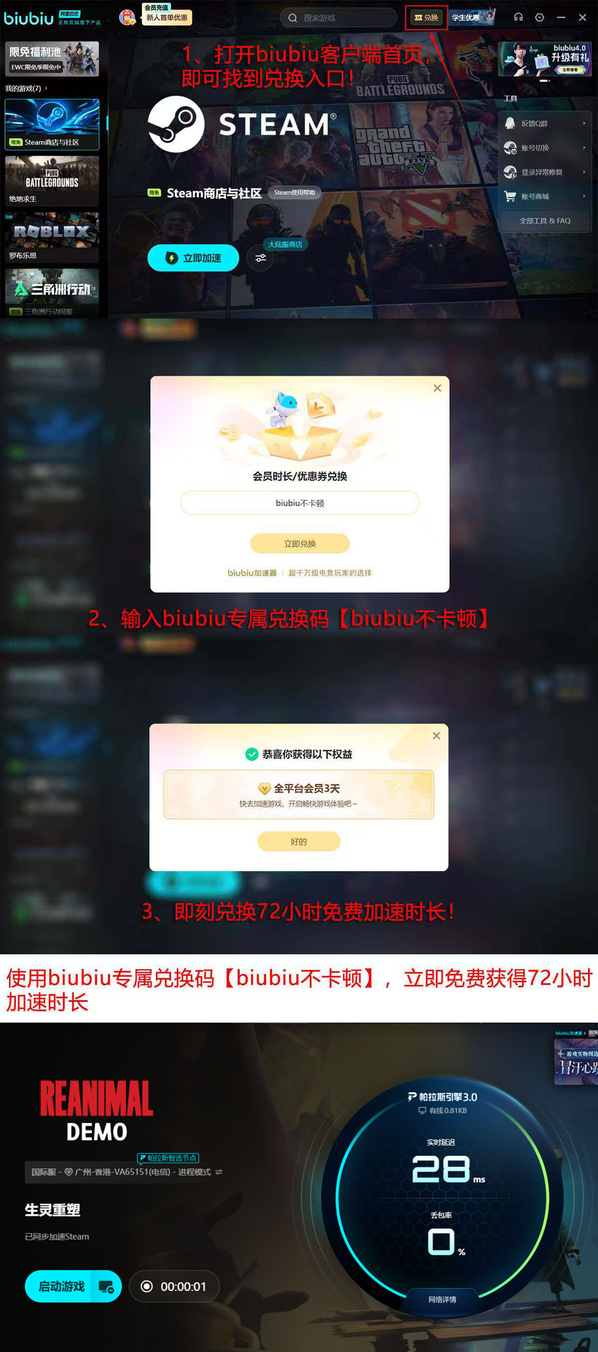 新用户可通过注册账号即时获得24小时免费试用权限;登录后前往首页“兑换”入口,输入口令【biubiu不卡顿】,即可额外领取72小时加速时长,总计享有96小时无门槛体验周期。