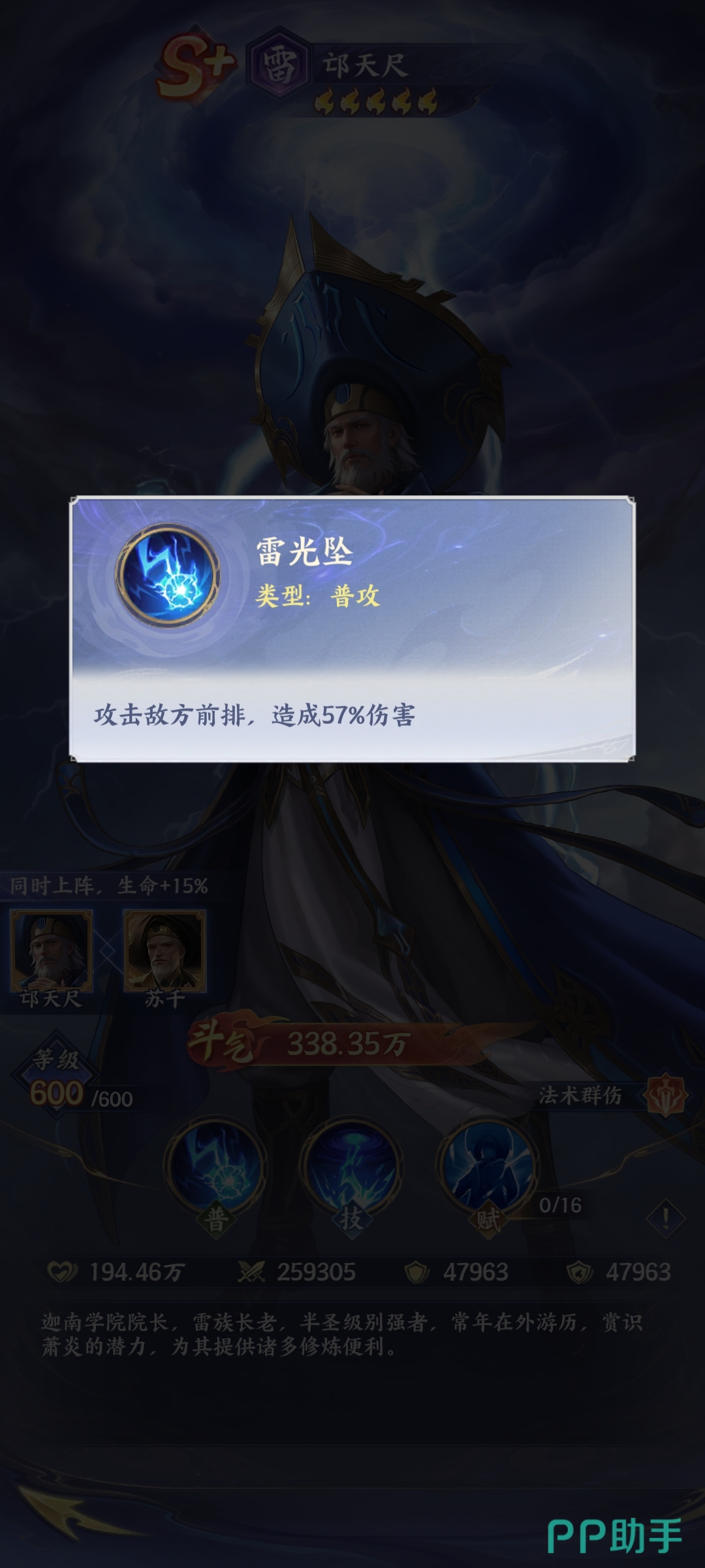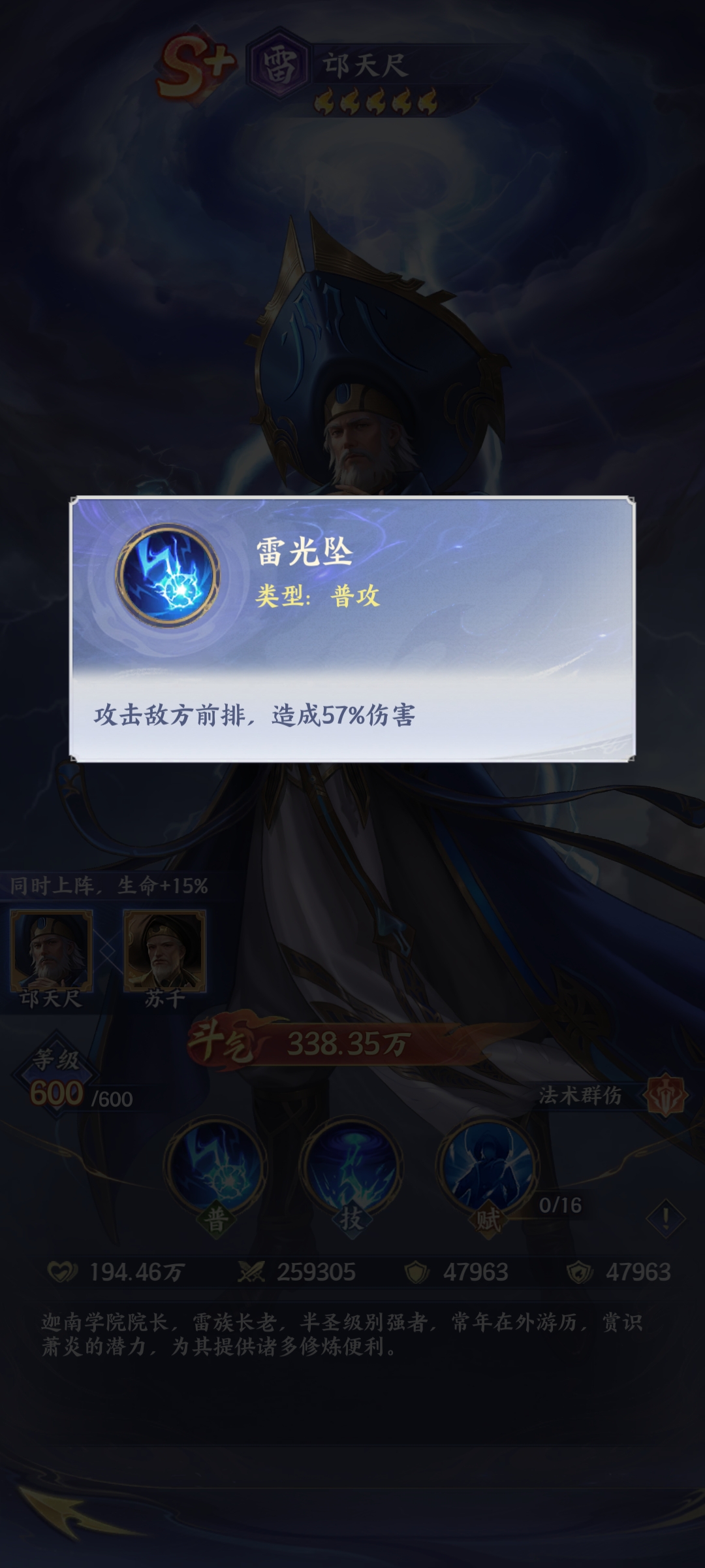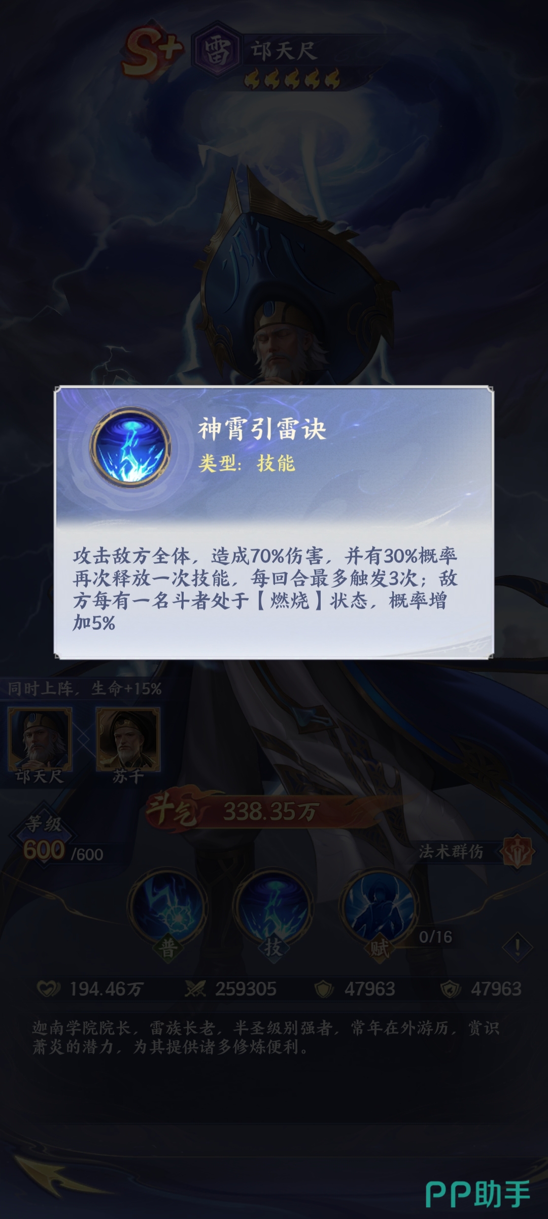 邙天尺的实力其实还是比较强悍的,而他属于法术纯伤,针对这方面的话相信玩家深入了解就可以看到,它的普通攻击技能,雷光坠,能够有效的打击敌人,并且还能够给敌人造成法术伤害,一旦形成这样的情况,能够为后续的爆发奠定一定的基础。而他真正的绝招其实是神霄引雷诀,一旦施展之后,往往能够有效地攻击全体的敌人,能够让敌人形成百分之70的伤害。