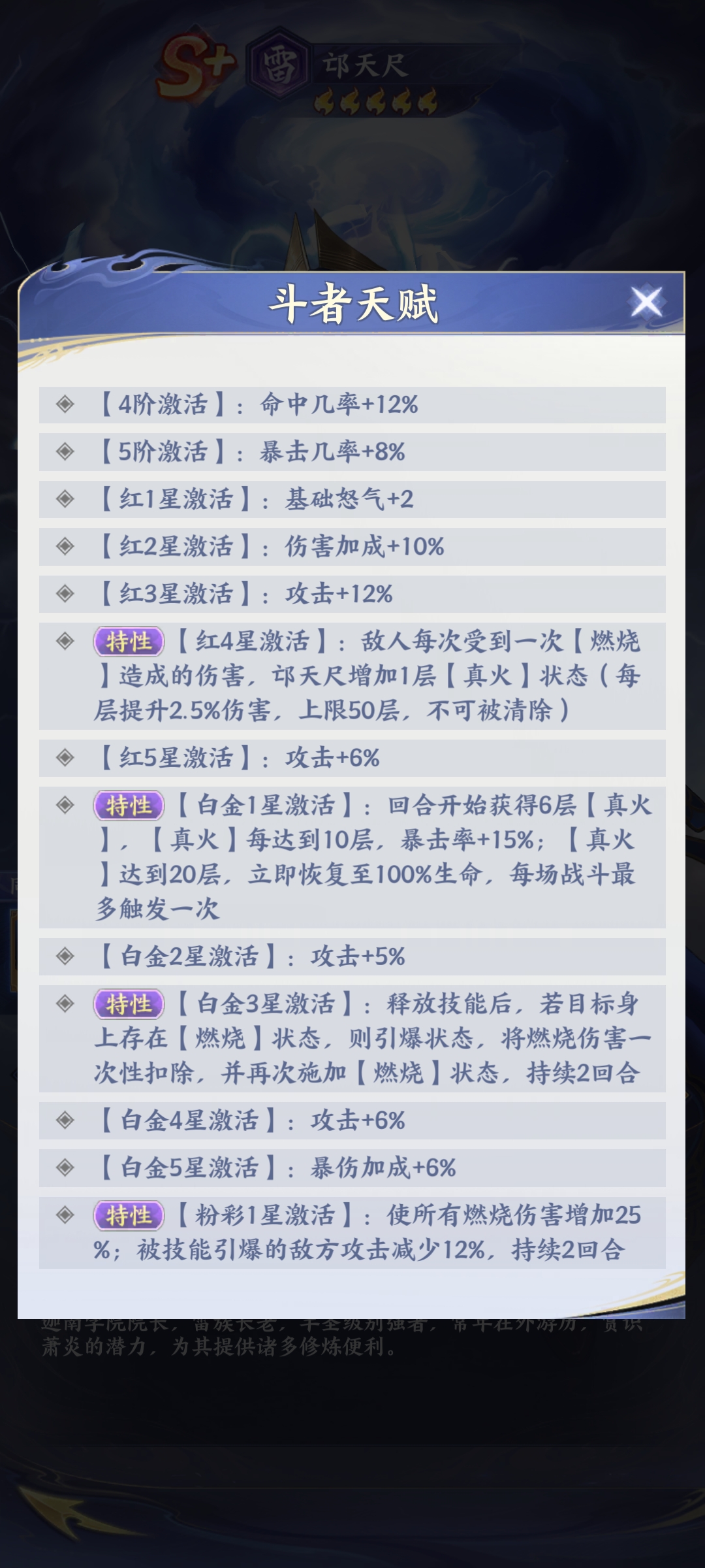其实到了白金一星的时候,邙天尺的生存能力往往会得到提升,并且它的输出效率也会得到提高。其实在战斗刚开始的时候,他的伤害加成就会特别的高,一旦他的真火达到10层的时候,他的暴击率得到提高,当他的真火达到20层的时候,他其实在战斗的过程当中能够立即恢复到100%的生命值。不过玩家这时候要注意,每场战斗最多能够爆发一次。