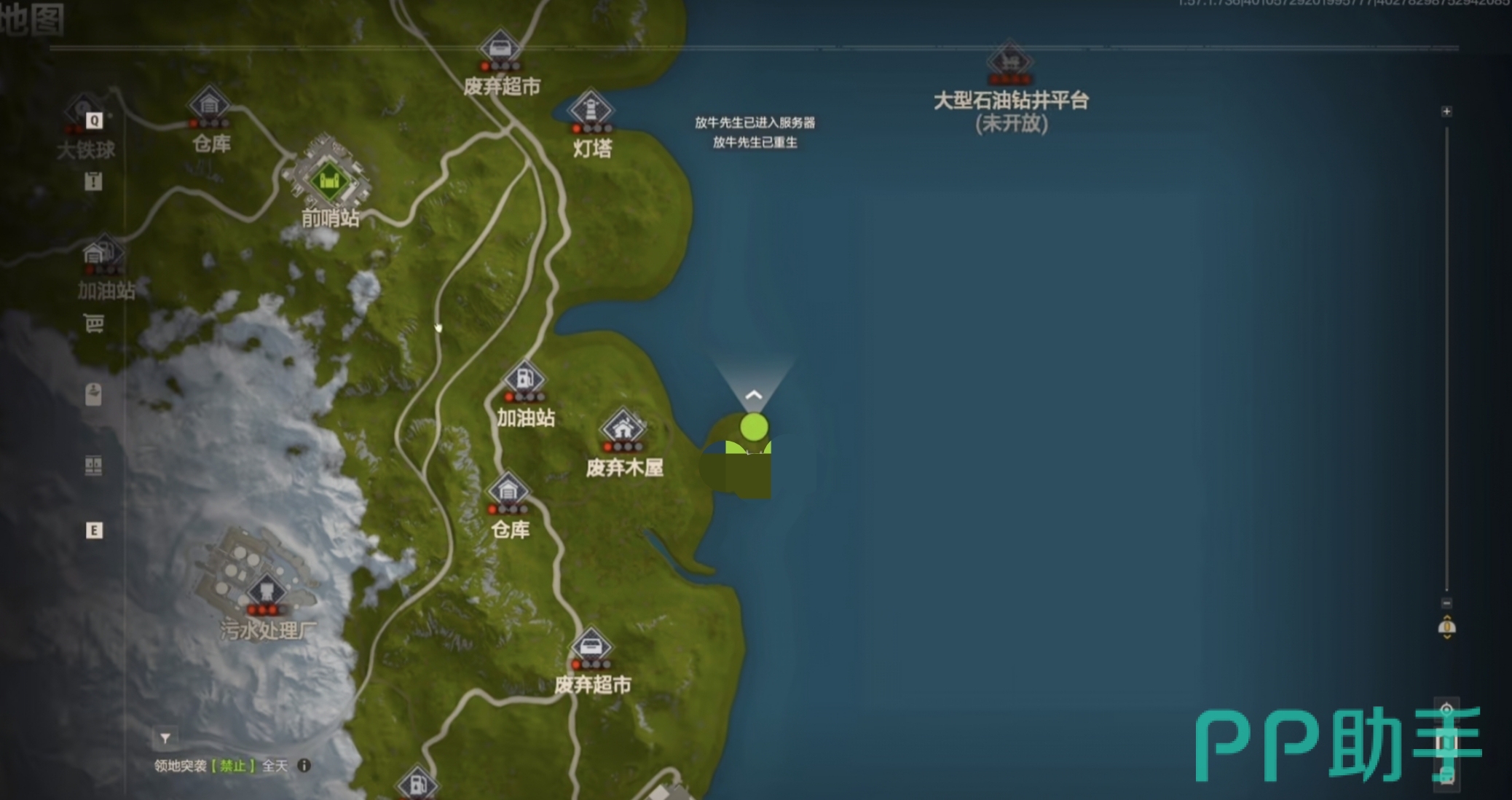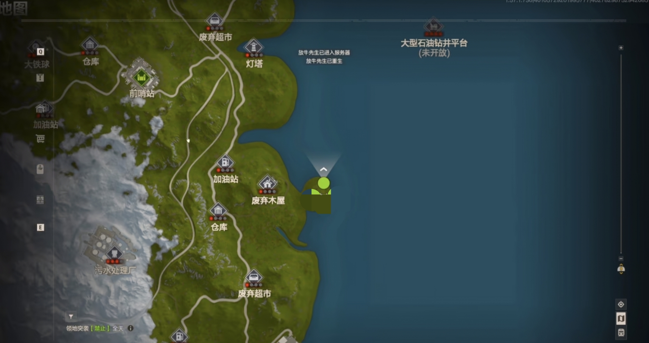 游戏当中还标记了几个较为安全的地区,玩家打开地图看到带有绿色标志的地方就是安全区域,玩家要注意保证自己在没有威胁的状况下进入,可以在里面进行资源交易和调理休整,得到自己想要的工具和装备,提高收集资源的效率和武器装备开战竞争的战斗力,价值较高的资源收集点,有小型石油钻井平台,这里能够生产柴油,产出的产量非常高,但是敌人分布的也较为密集,玩家可以和好友合作采集。