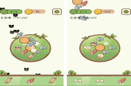 围绕合成机制展开,界面中央设旋转圆盘,支持最多容纳9个食物道具。玩家通过手指拖拽,将相同品类的食物投放至盘中,两两合并后升阶为更高品质料理。不同等级食物具备独特视觉标识与属性效果,需统筹资源分配与合成优先级,为拟人化宠物角色持续供应适配餐食,强调轻策略与节奏把控。