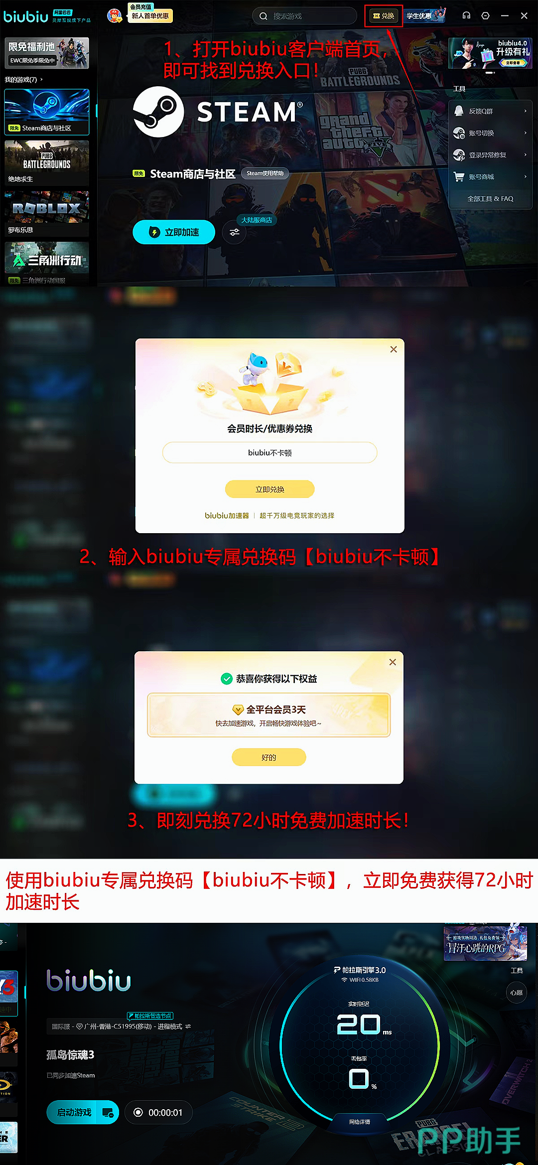 在持续迭代中,biubiu加速器同步优化用户权益体系:新注册用户完成实名认证后,即可激活24小时全游戏免费加速权限;所有活跃账户输入专属兑换码【biubiu不卡顿】,还可额外获赠3天通用加速时长,无绑定限制,支持多端共享。