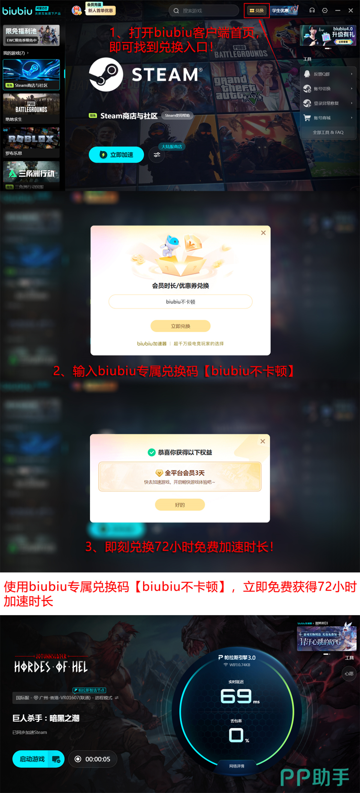 需注意,biubiu加速服务采用会员制,开通后方可享受持续稳定的加速效果。新用户注册即赠24小时免费体验时长;另提供通用兑换码【biubiu不卡顿】,输入后可额外获得72小时加速权限,该码适用于全部账号,包括已注册的老用户。