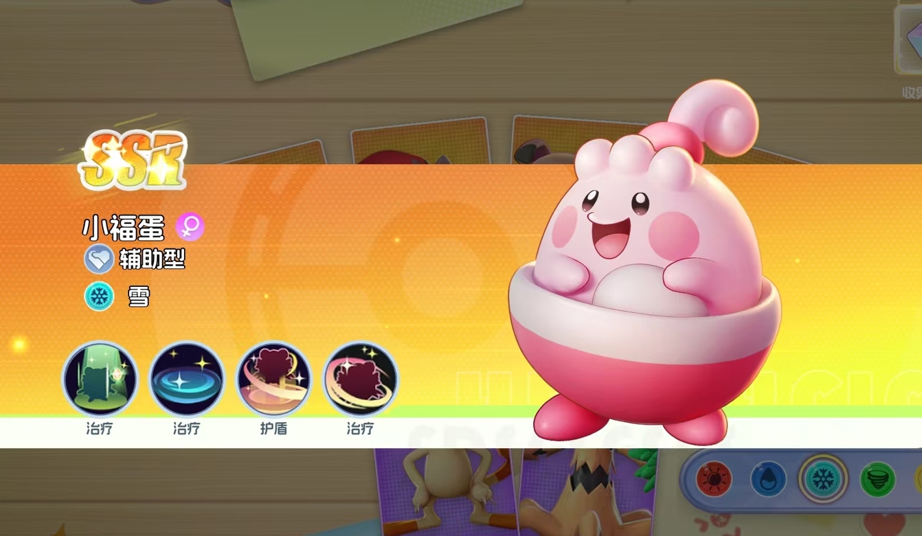 能通过普攻和技能为队友回复血量的宝可梦,且治疗能力极为出色,仅凭它一只宝可梦就能令队伍获得很不错的持续作战能力。最重要的是,当小福蛋成功升至41级后,它还会解锁新技能,释放时能对全体友方宝可梦增加基于它自身攻击力的护盾,为队友带来更优异的生存保障。
