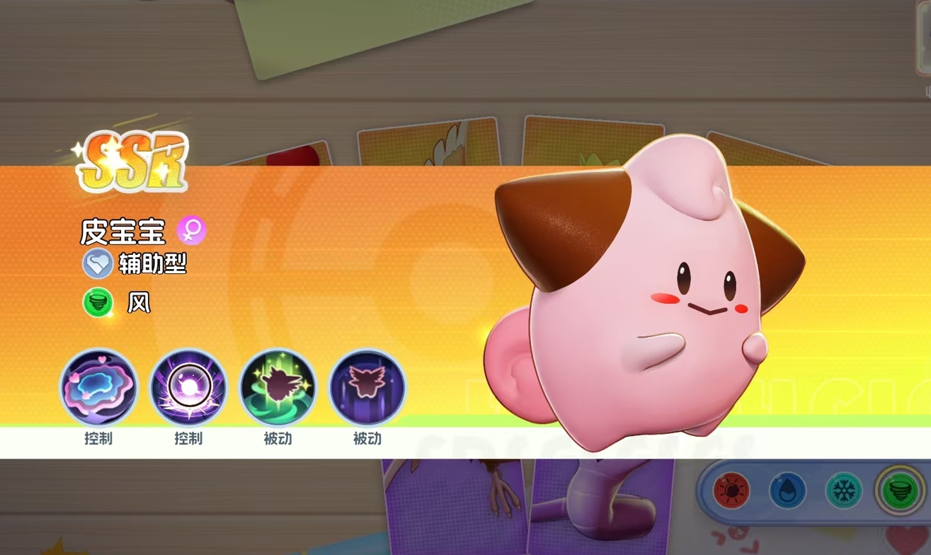 皮宝宝主要通过为敌方施加控制来为队伍作贡献。它的大招可令敌方陷入着迷,是超大范围的群控,11级解锁的技能还能主动锁定敌方宝可梦数量多的区域释放,令被命中的宝可梦无法动弹,配合41级的技能治愈波动,还能让它在释放技能的同时为队友回复血量。