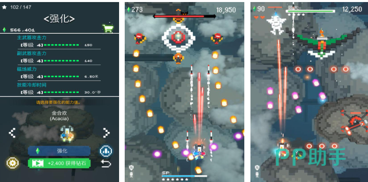 本作以经典像素美术风格重构空战玩法,敌机、子弹与场景均采用点阵图形呈现,画面细节考究,兼具复古韵味与现代优化。关卡设计强调成长性,玩家可自主强化机体属性、更换多元武器组合,实现战力阶梯式跃升,适配不同操作习惯与战术倾向。