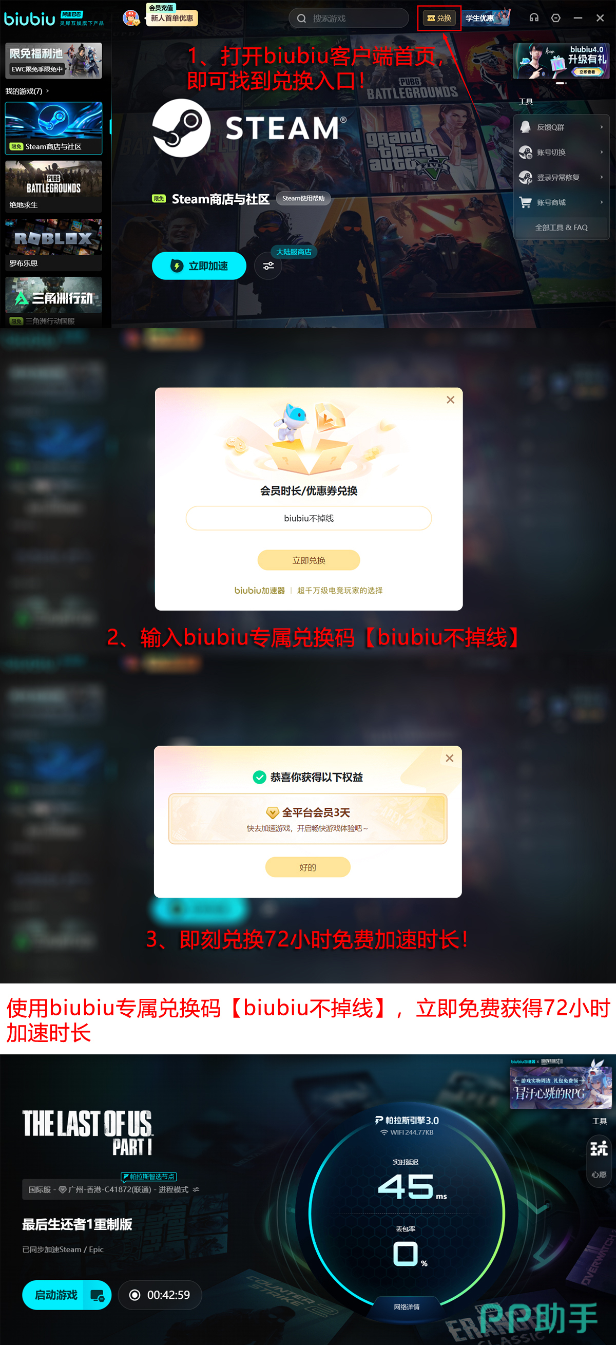 当前新用户可享多重权益:注册即赠24小时免费加速时长;另提供公开兑换码【biubiu不掉线】,成功兑换后可额外获得72小时服务权限。两项叠加,总计可获96小时连续加速支持。依托帕拉斯引擎3.0的低延迟传输机制与连接稳定性优化,有效降低因网络波动引发的闪退概率,保障游戏顺畅运行。