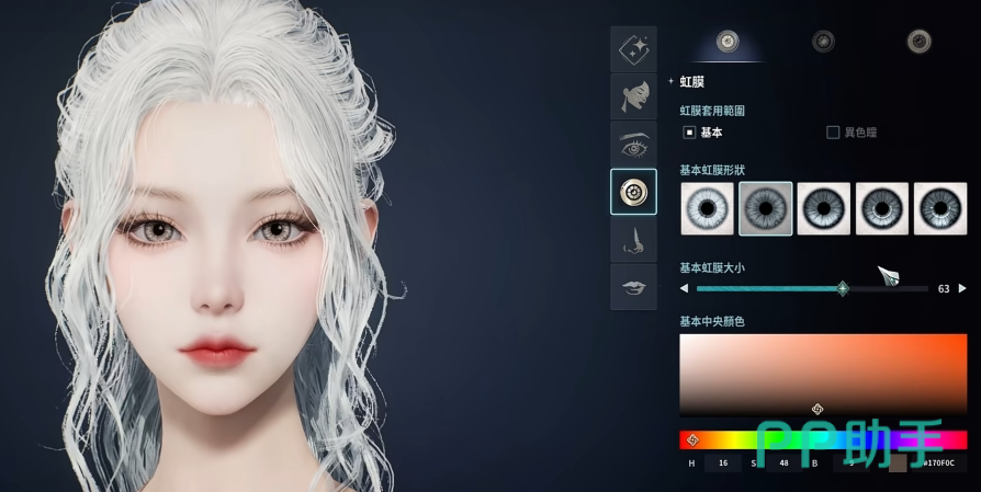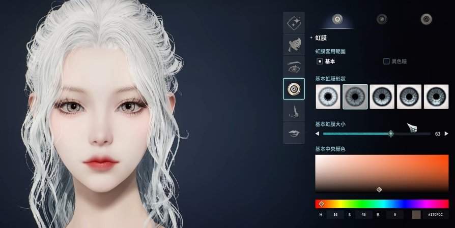 瞳孔样式选用第二款高反光类型,尺寸设为63,放大视觉焦点;中央虹膜色建议选浅灰或浅琥珀,光照下可呈现通透水润光泽,营造柔中带韧的情绪张力。