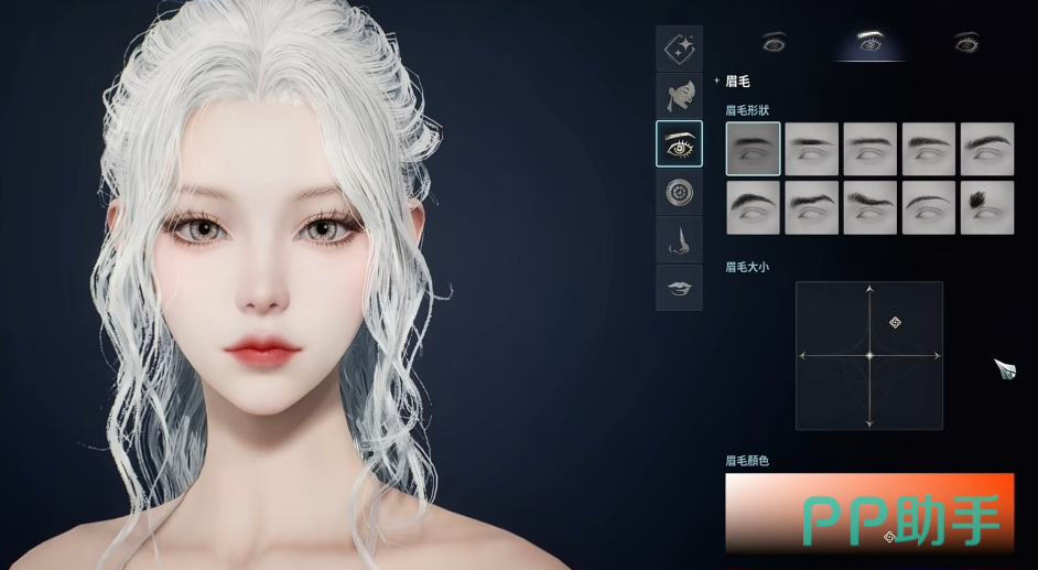 眉毛部分推荐启用第一款平直眉型,并将其缩放锚点向右上方微调,形成自然上扬弧度;同时适当收窄眉体宽度,增强线条利落感。颜色方面建议采用中褐色系,与浅色系发饰、时装兼容性更佳,整体协调不突兀。
