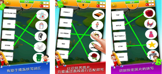 本作聚焦视觉化英语启蒙,采用“单词—图片—释义”三维匹配模式。收录300+生活化高频词(含动物、食物、颜色、动作等主题),所有配图均由专业儿童插画师绘制,色彩明快、形象准确。支持双人协作闯关与错词自动归档功能,便于针对性复习巩固。