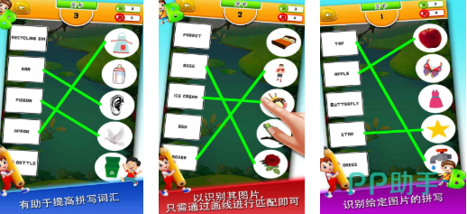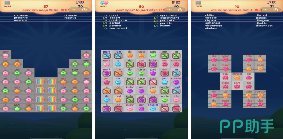 将英语词汇学习深度融入三消机制,覆盖PEP小学英语教材1–6年级全部核心词表。玩家通过滑动连接相同字母组合形成有效单词(如“cat”“dog”),系统即时播报发音并展示例句与配图。含200+原创卡通插画与40余种音效反馈,强化多感官协同记忆效果。