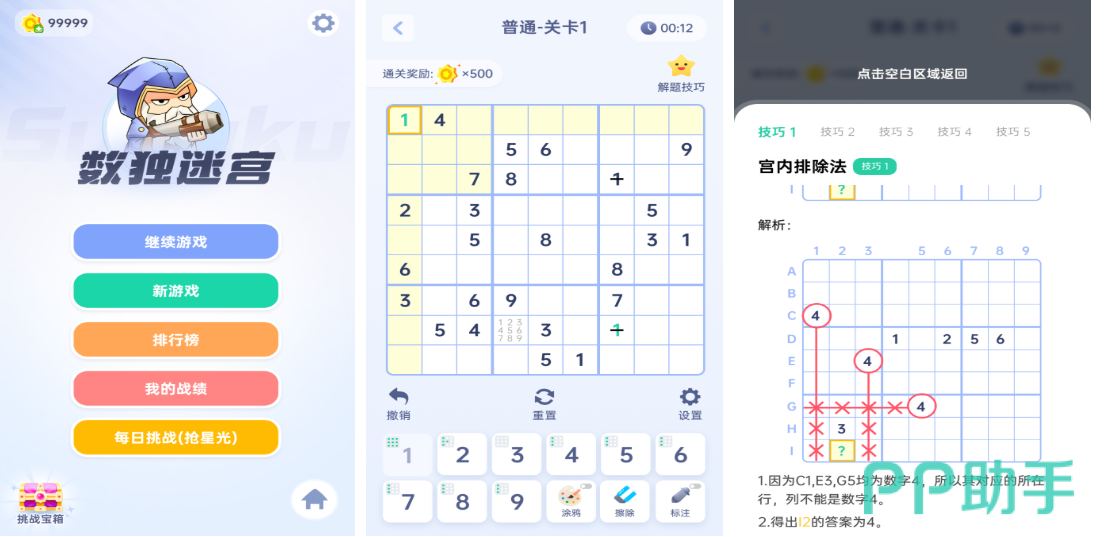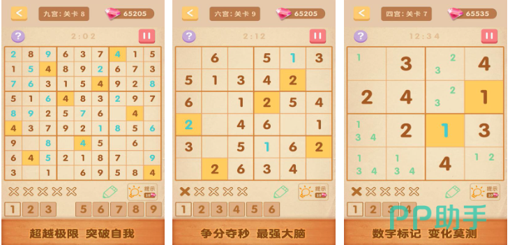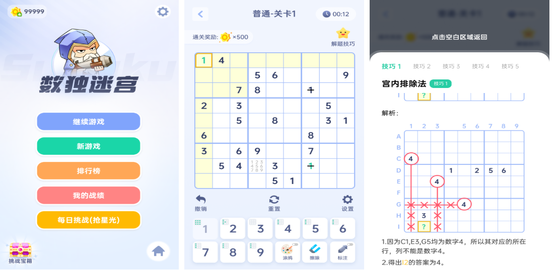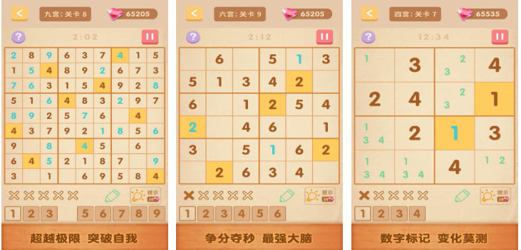 数独大全采用木质纹理UI设计,营造安静专注的游戏氛围。除标准9×9模式外,还包含4×4儿童版、对角线变体及不规则宫格等多元玩法。每道题目均经人工校验确保唯一解,支持“提示—纠错—回退”三重辅助系统,零基础玩家也能在10分钟内掌握核心规则并独立通关。