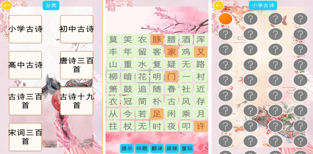 诗词换换乐专为低龄段儿童(6–9岁)研发,以唐诗三百首精选篇目与小学语文故事类古诗为主要内容。采用“卡片置换”核心机制——玩家通过拖动汉字碎片拼合完整诗句,系统实时校验并播放吟诵。内置“小诗人成长档案”,记录每日学习时长、通关数量与掌握率,生成可视化周报供家长参考。