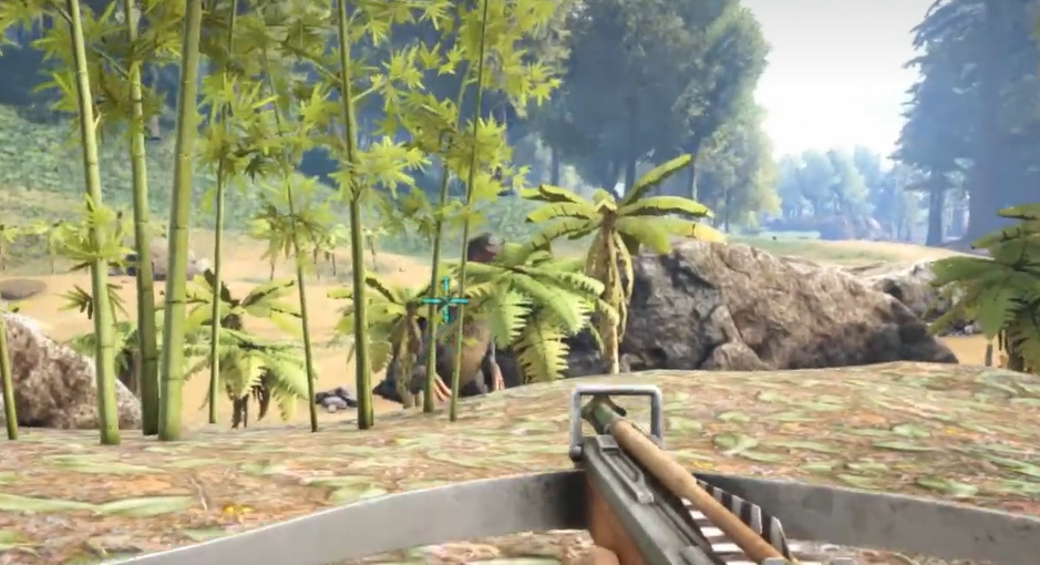 搭好U型屏障以后,拿出弩箭朝镰刀龙射一箭。射完以后马上转身就跑,跑得越远越好,因为镰刀龙的移动速度其实挺快的,如果跑慢了很容易被它追上。跑远了以后镰刀龙就会找不到你,这时候它就会去攻击那个U型屏障。你站在远处等着,等看到镰刀龙开始攻击木头柱子了,再慢慢靠近,用弩箭继续射它。