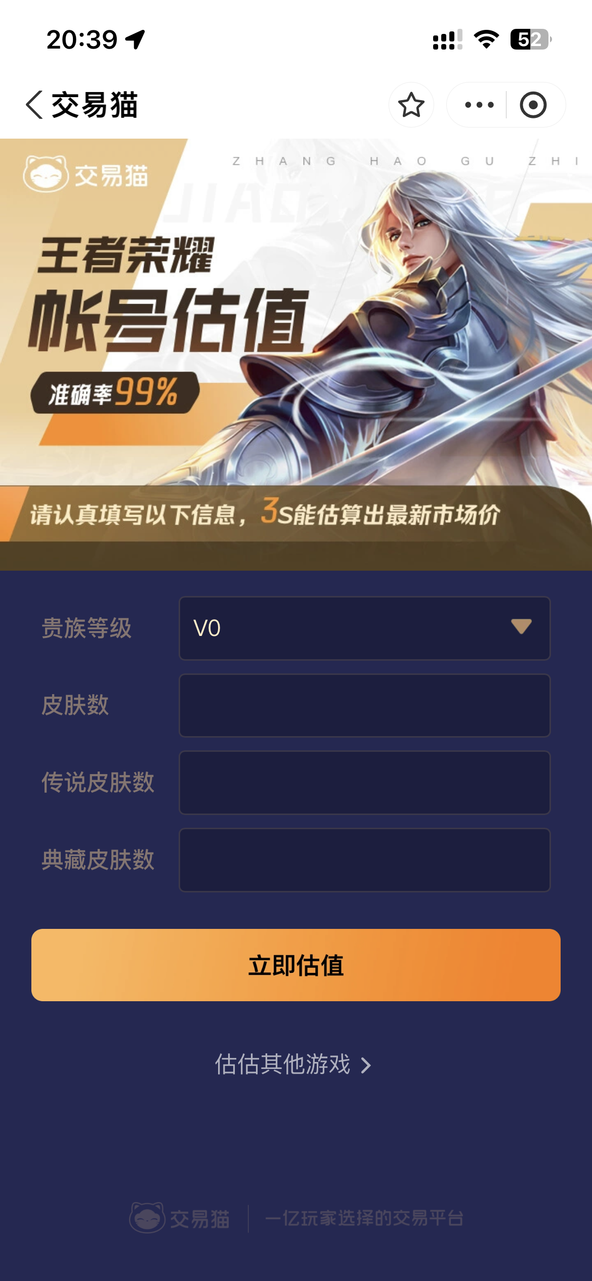 定价难,是多数卖家的第一道门槛。定低了吃亏,定高了无人问津。交易猫提供专为《王者荣耀》设计的免费智能估价服务:进入平台首页后,搜索“估价”即可快速调用该功能,系统基于实时市场数据、英雄数量、皮肤稀有度、段位分布、战力数值及历史成交记录等多维参数建模分析,数秒内输出参考报价,估价准确率超99%。