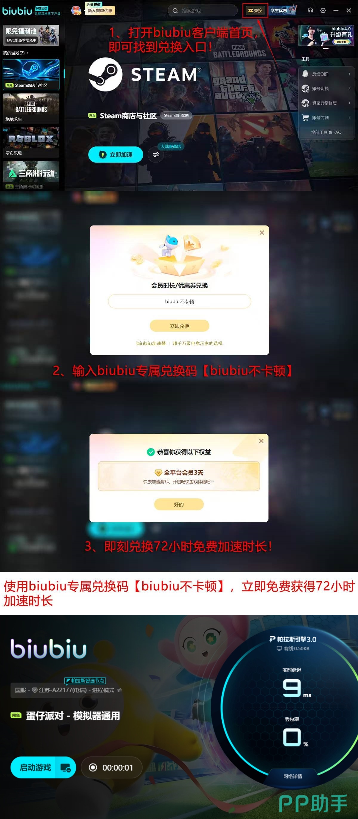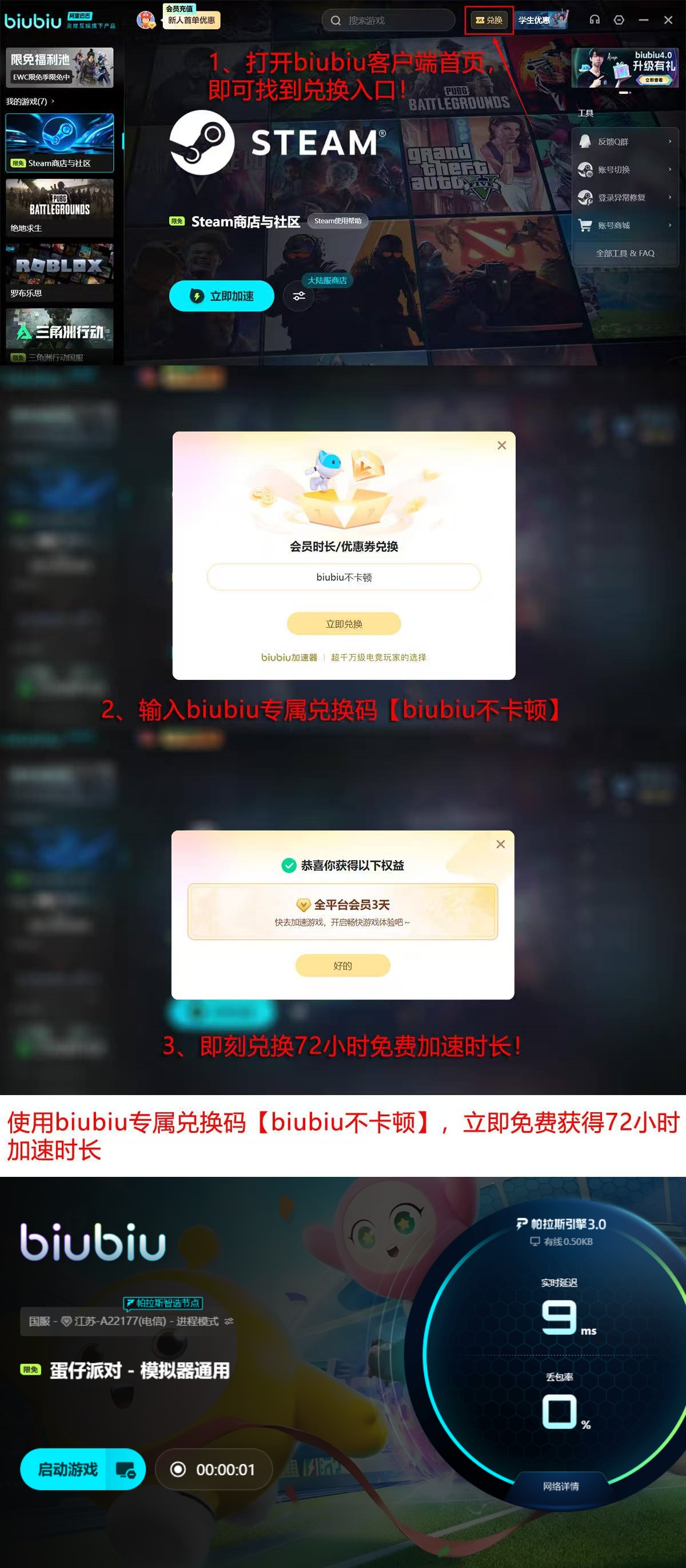 新用户完成注册后即可立即启用24小时全功能免费加速权限。若需延长体验周期,可输入专属兑换码【biubiu不卡顿】,成功核销后将额外获赠3天连续加速时长,无需绑定支付方式即可畅享全部核心功能。